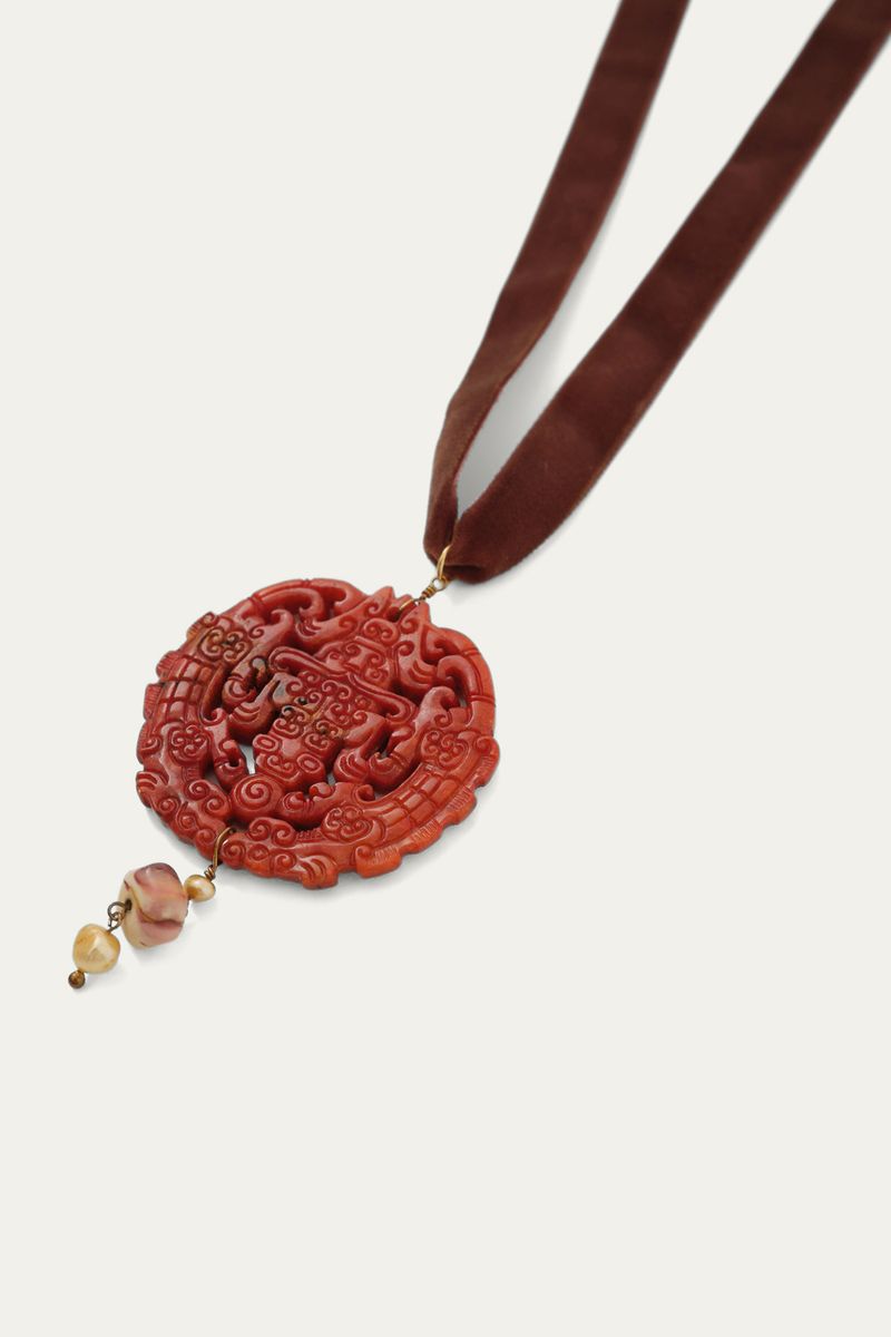 Colar Mandala Jade Vermelha com Jaspe e Pérola dourada, em Fita de Veludo