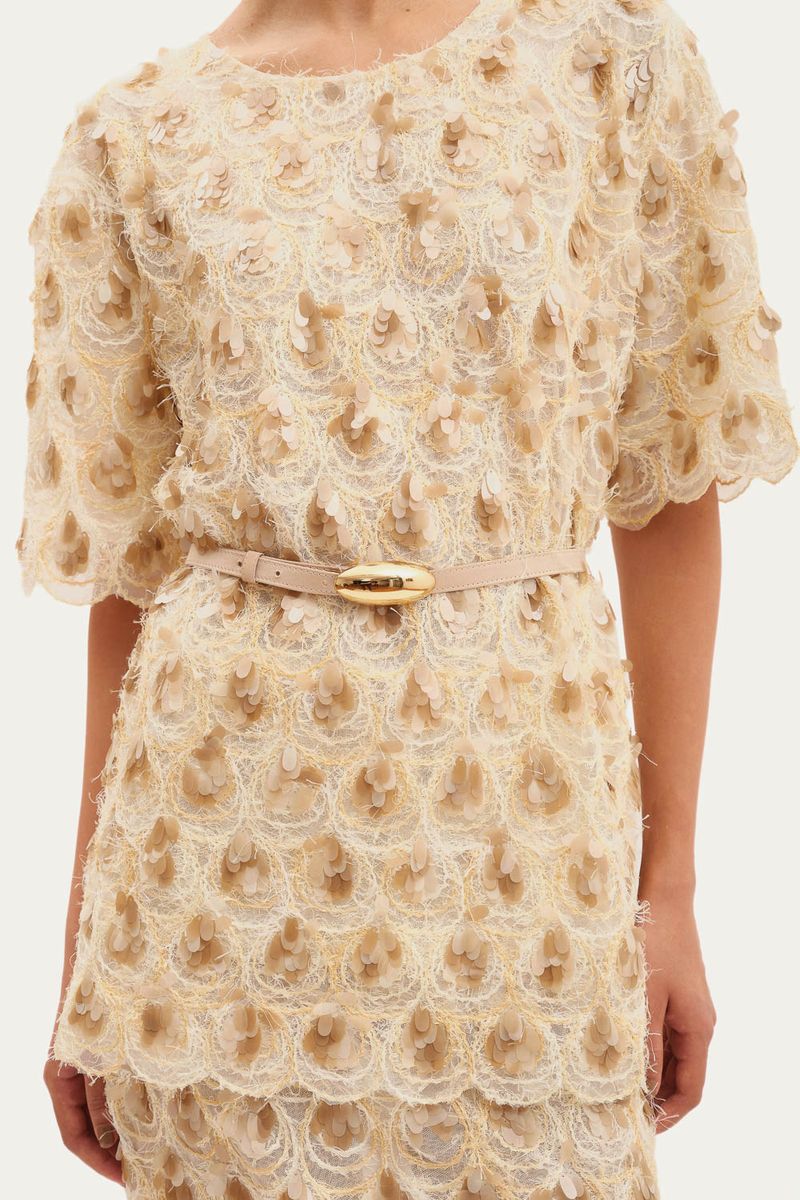O Conjunto Gantelle Framed apresenta uma estética refinada, elaborado em 100% Poliéster. Sua textura é enriquecida por um delicado tecido de penas e sutis detalhes em paetê. Esta proposta exclusiva, que inclui uma T-Shirt oversized e uma saia midi anágua, confere um visual contemporâneo e singular, ideal para quem aprecia uma sofisticação discreta.