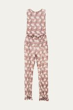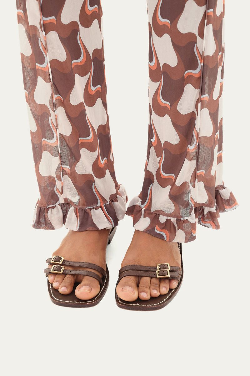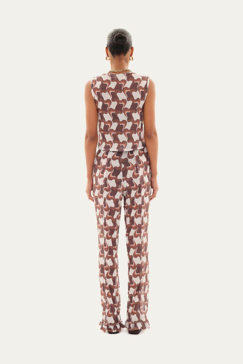 Regata com modelagem simples e reta. Calça com cintura com elástico para melhor ajuste. Tecido em tule leve e fluido com estampa aplicada. Conjunto indicado para composições casuais ou sofisticadas.
