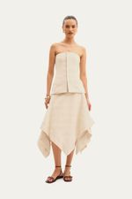 Corset em tapeçaria de fibra reciclada. Dispõe de duas ancas na lateral da peça para modelar o corpo. Fechamento por zíper invisível nas costas da peça. Composição: 78% algodão, 22% poliéster