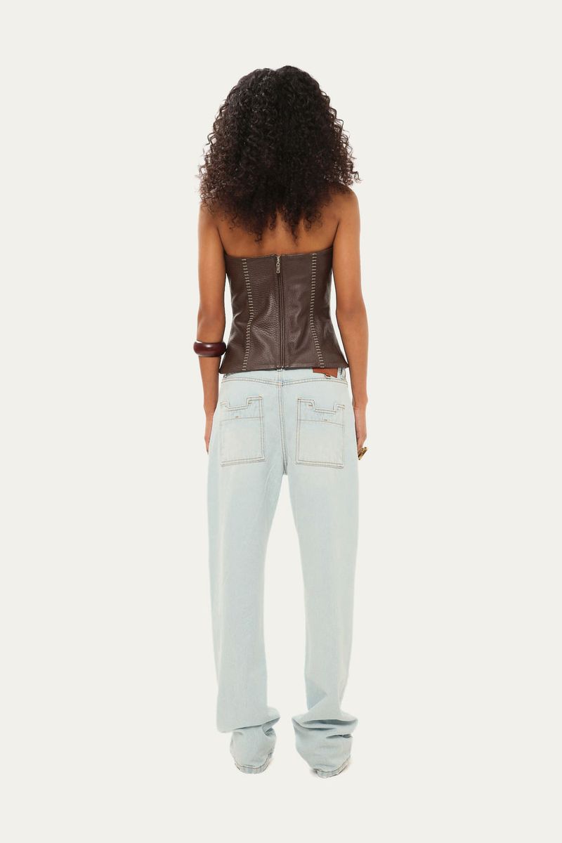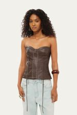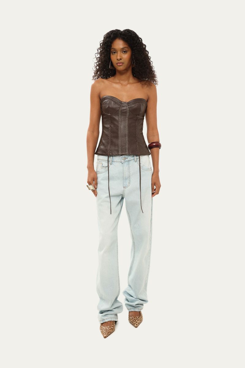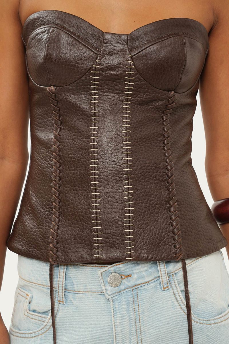 Confeccionado em couro caprino 100%, este corset revela uma estética singular através de seus detalhes frontais trançados e costurados. Com um forro embutido que prioriza o conforto e um fechamento posterior em zíper, a peça oferece um ajuste refinado e um visual de sofisticação discreta.