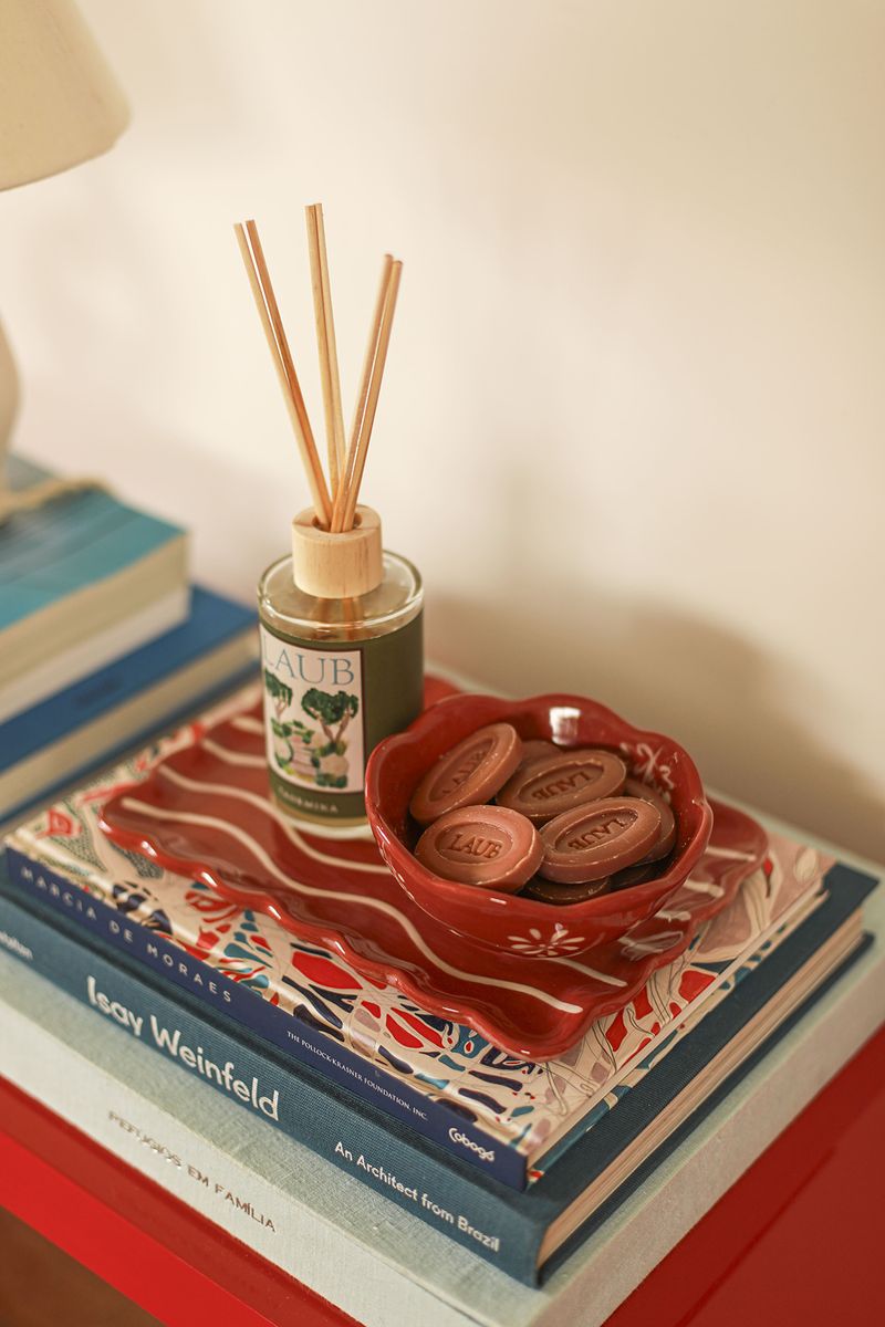 Kit de difusor de ambientes, mini sabonetes e bowl de cerâmica.