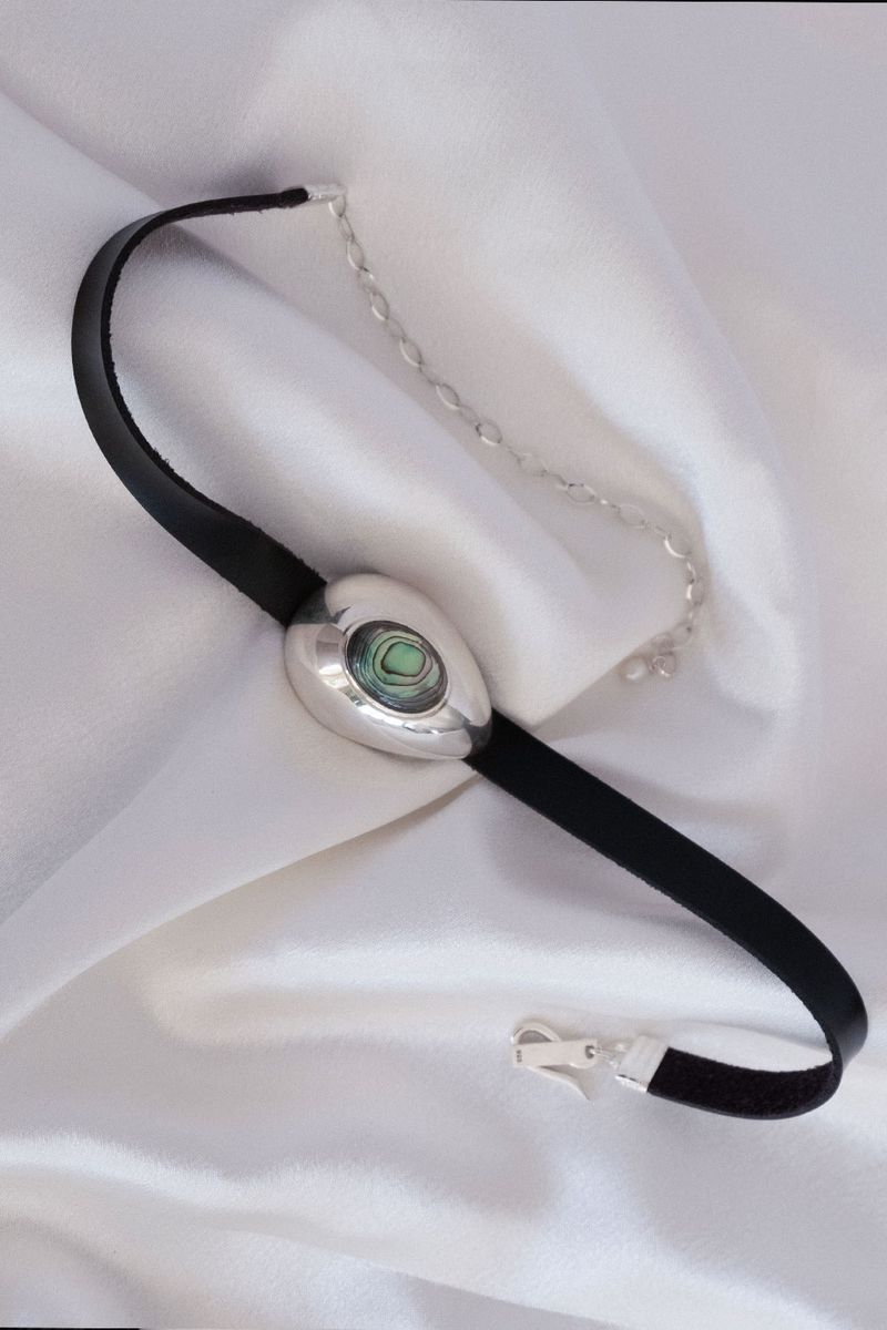 Prata de Lei, concha de Abalone e fita de couro preta.