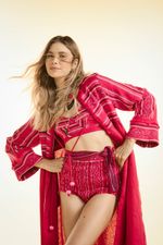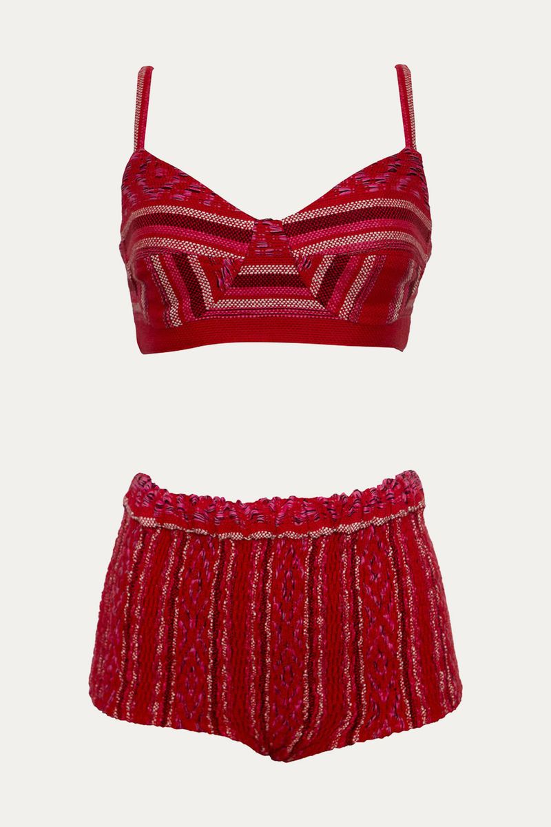 Top de modelagem ajustada, com decote meia taça, e costas em lastex. Possui alça fina. Hot pants confeccionado em tear com lastex. em toda a peça. 42% algodão 42% acrílico 16% viscose / forro top 100% algodão