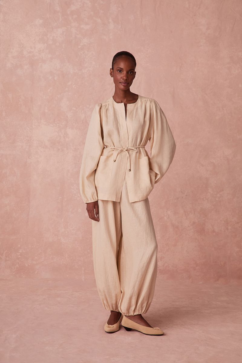 Confeccionado em linho classic, este kimono distingue-se pela delicadeza de suas mangas bufantes e pelo refinado cinto roliço, que permite um ajuste sutil à cintura. A peça confere uma sofisticação discreta e uma leveza fluida, ideal para complementar visuais com elegância e conforto, realçando o movimento.