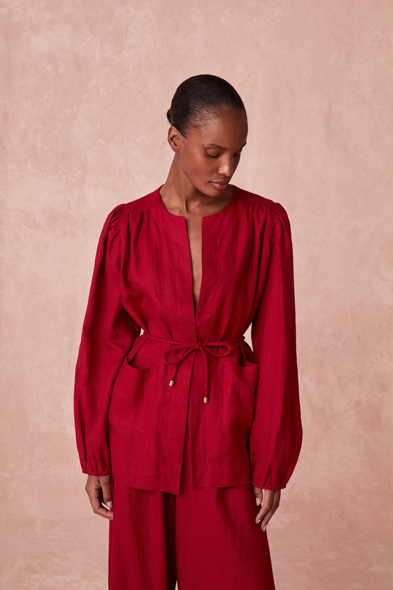 Confeccionado em linho classic, este kimono distingue-se pela delicadeza de suas mangas bufantes e pelo refinado cinto roliço, que permite um ajuste sutil à cintura. A peça confere uma sofisticação discreta e uma leveza fluida, ideal para complementar visuais com elegância e conforto, realçando o movimento.