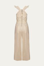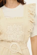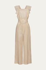 Macacão de modelagem acinturada e pantalona; com mangas de babado com bordado richilieu.