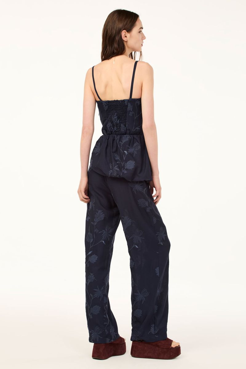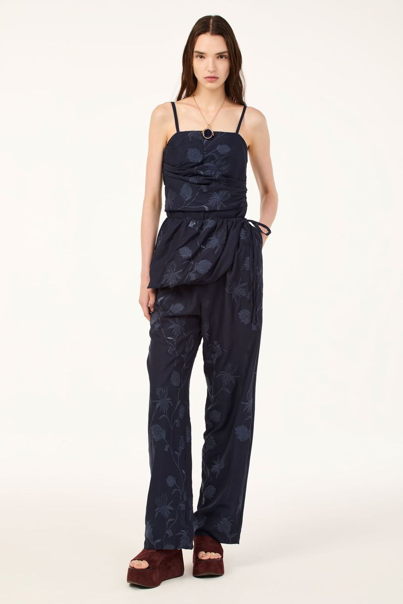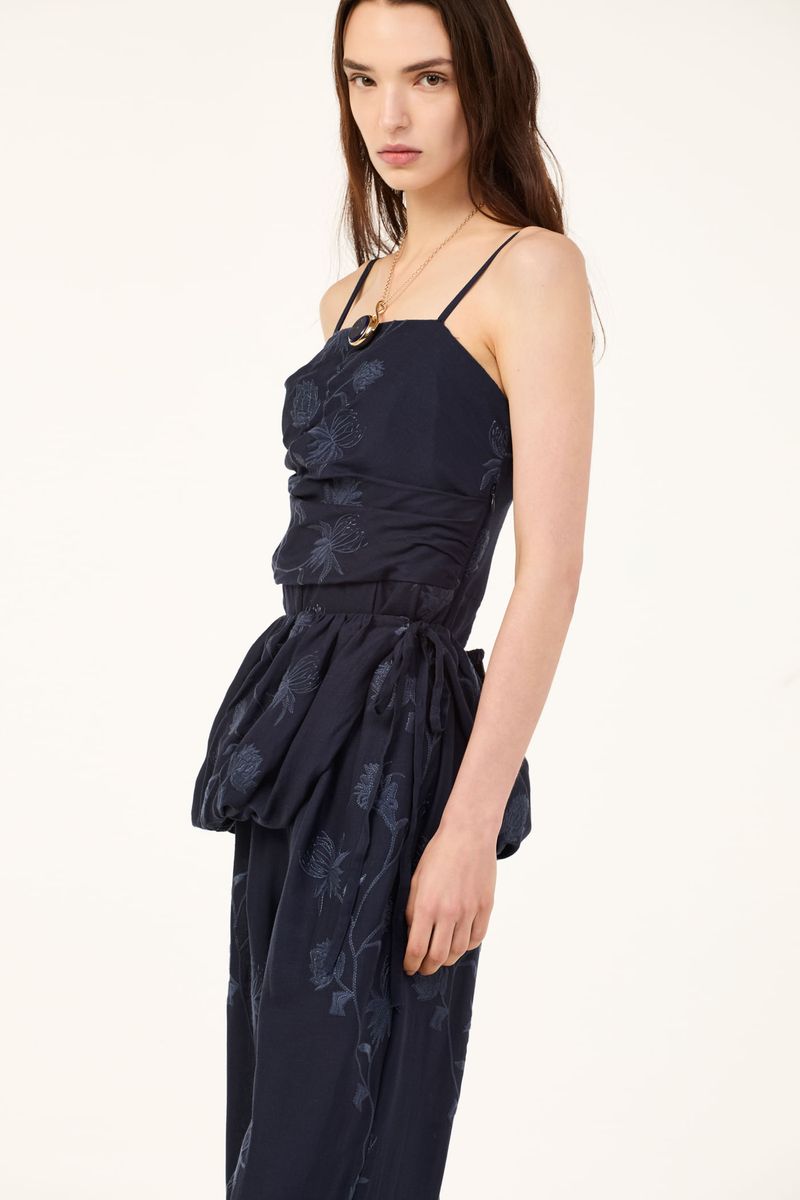 O macacao Ravena CRIS BARROS é elegante e estiloso. De Ravena, linho bordado com ramalhetes de flores orgânicas envolvidas por fio de lurex brilhante. Possui shape reto, corpo drapeado, sem alças, lastex nas costas para garantir o conforto, bolsos laterais funcionais e acompanha basque balonê com rolote de amarração que garante um charme extra à peça.