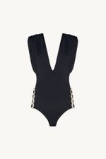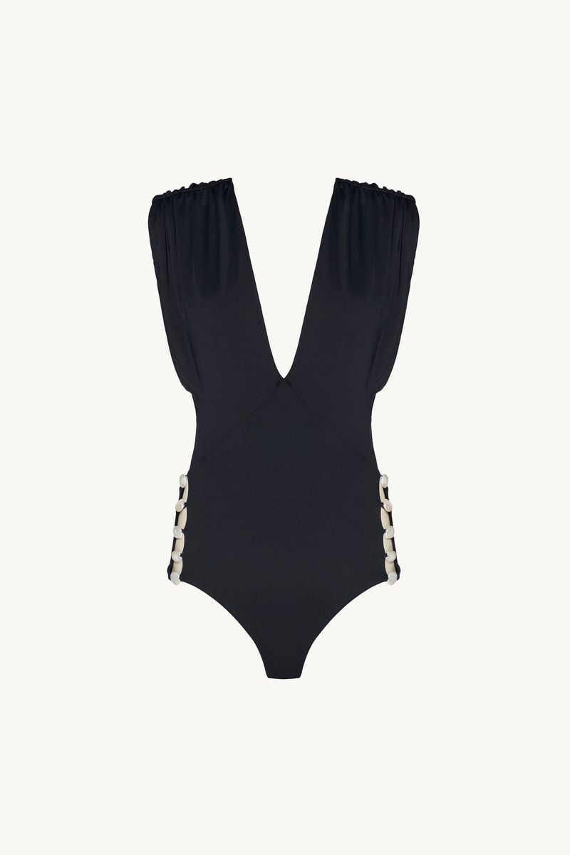 O maio Kalliste CRIS BARROS é cool e fashionista. Possui decote V, ombros franzidos, detalhes lateral com abertura e pérolas naturais e fechamento posterior com fecho de metal.