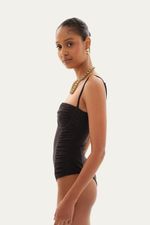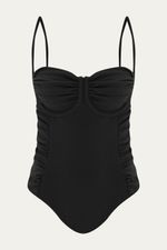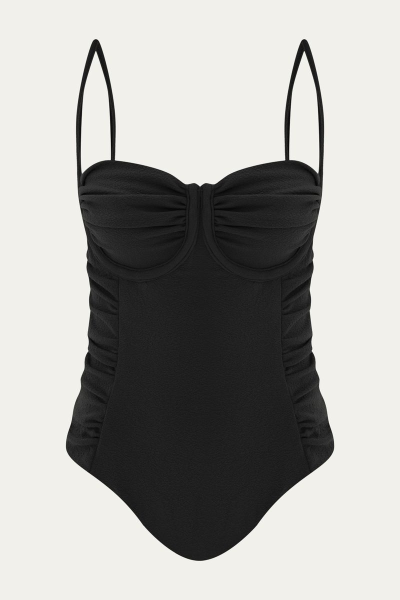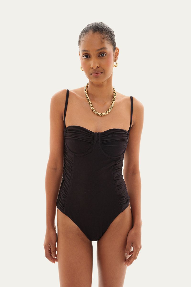 Modelagem estruturada. Drapeado frontal e lateral. Bojo com acabamento drapeado. Alças em rolotê trançado. Possui barbatanas laterais para sustentação. Peça indicada para maior conforto e segurança.