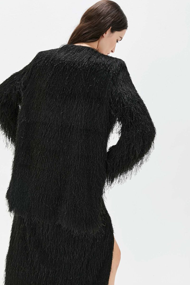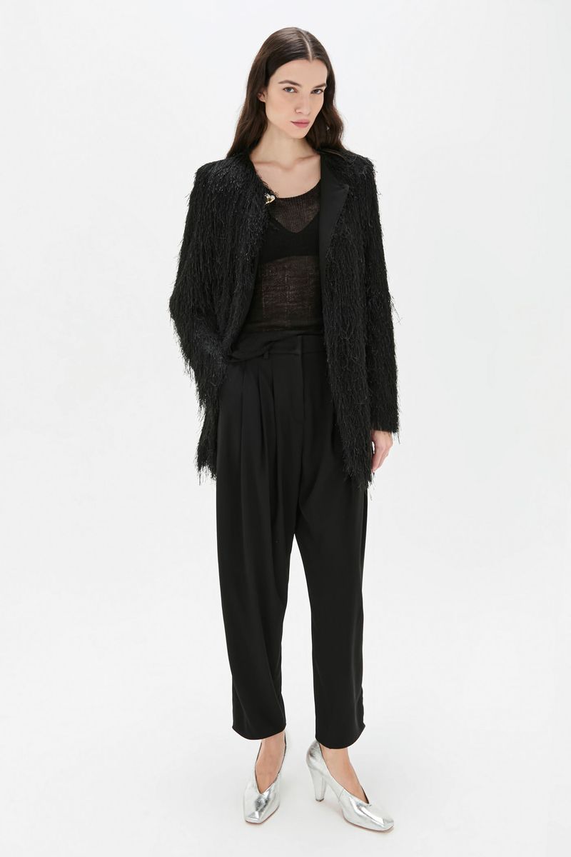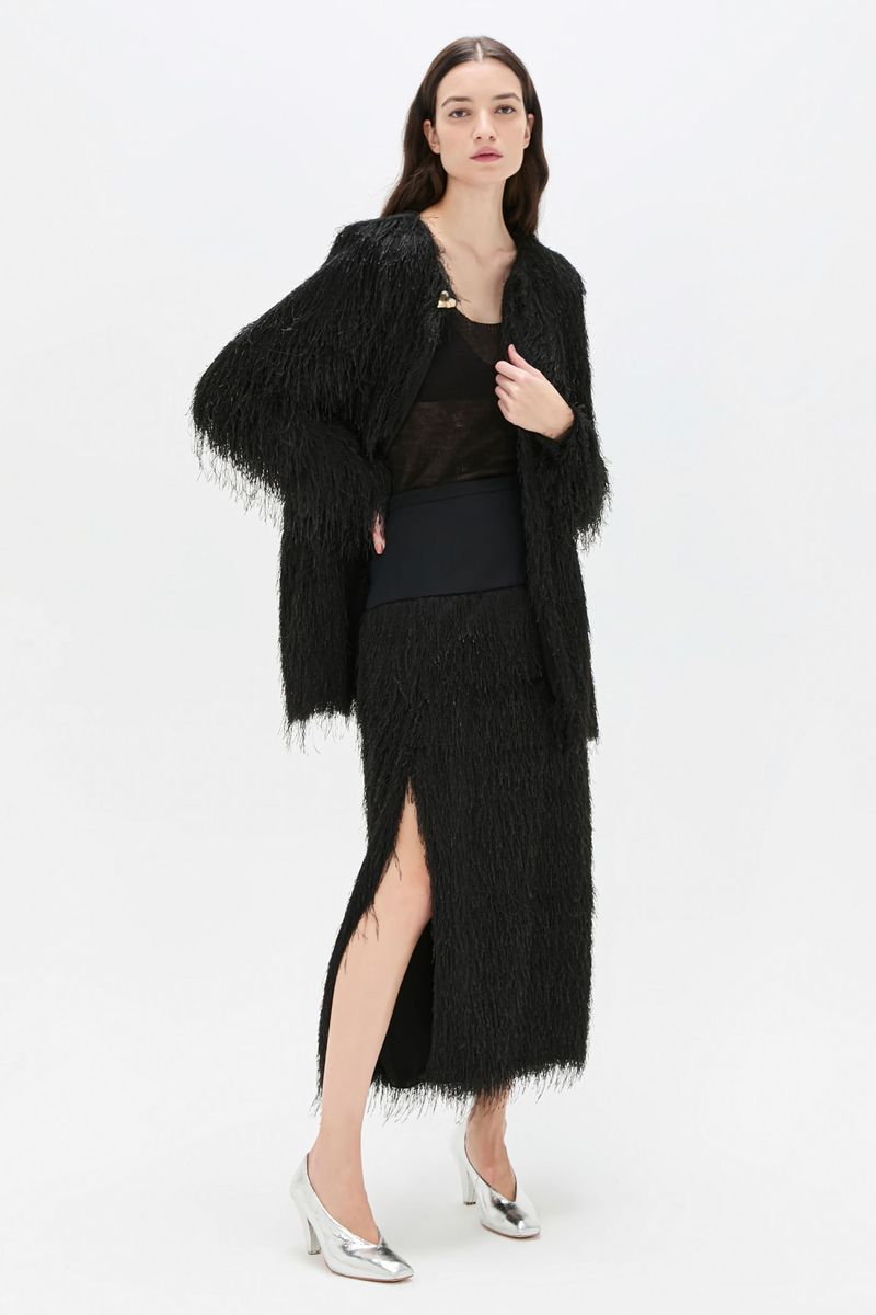 O manteau Lia CRIS BARROS é fashionista e super cool. De Dalia, tecido todo franjado, encorpado, com aspecto levemente acetinado e caimento solto e fluido. Possui shape mais curto e oversized, fechamento por botão de coração banhado à ouro, design exclusivo, desenvolvido em nosso atelier.