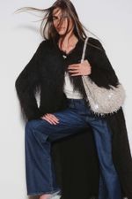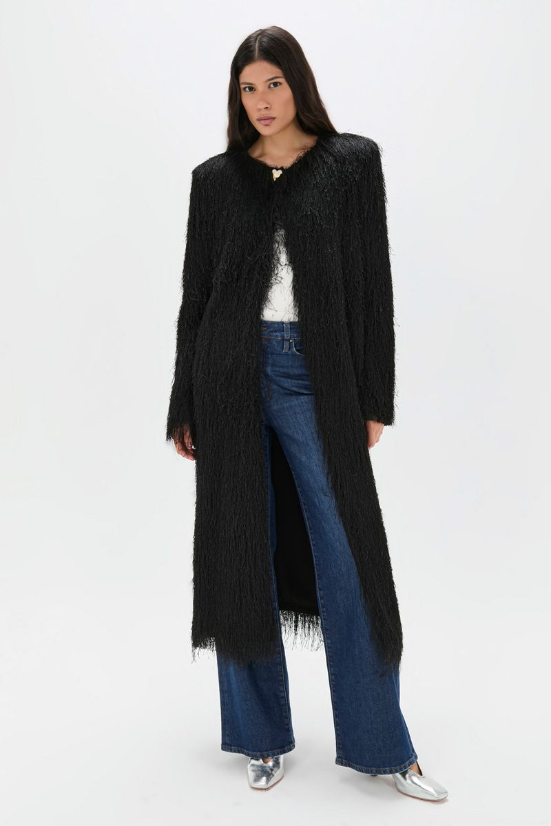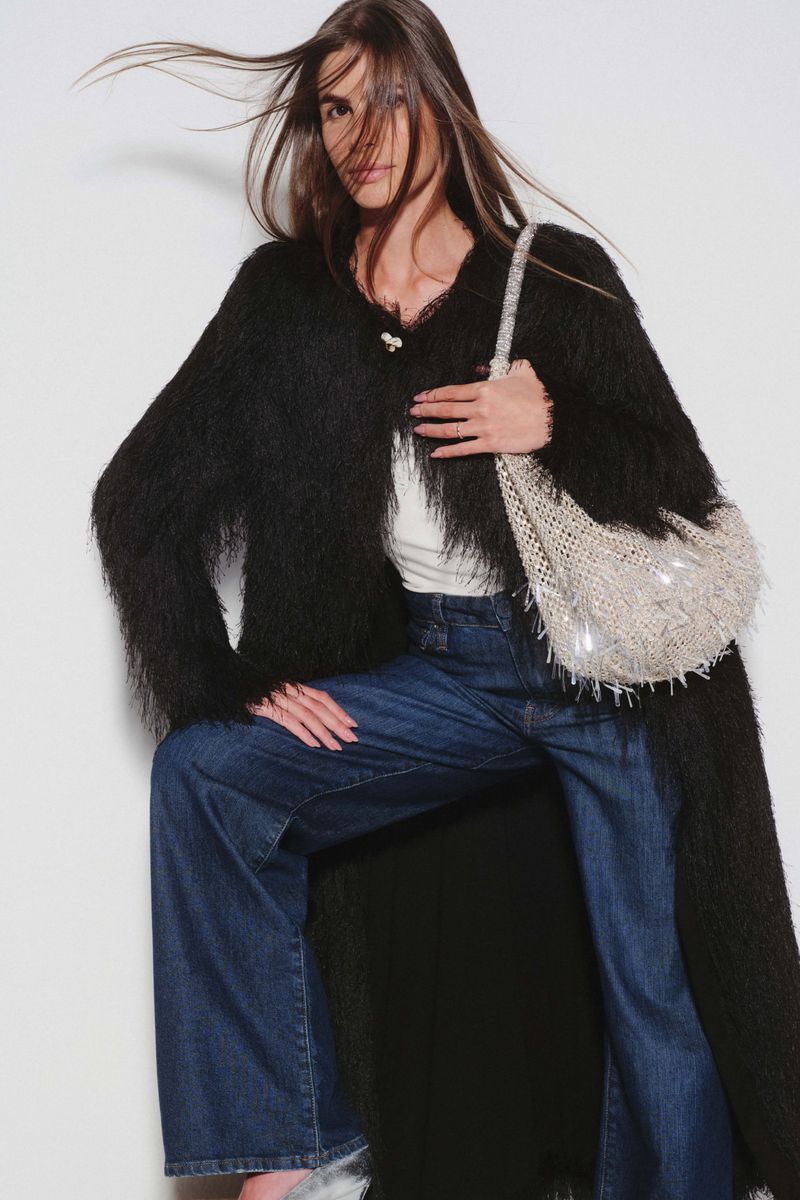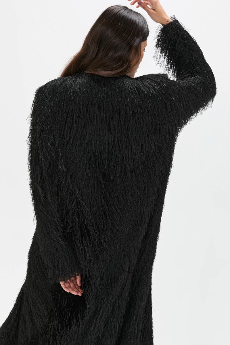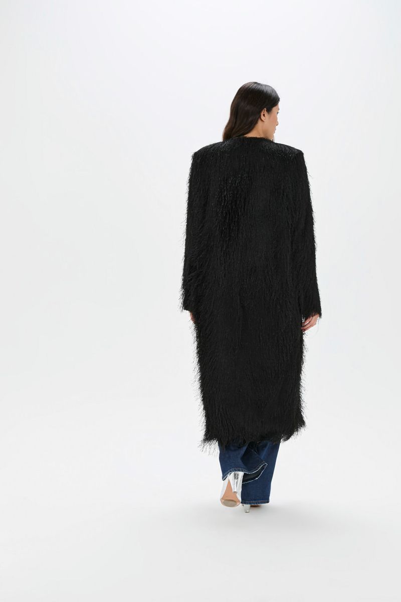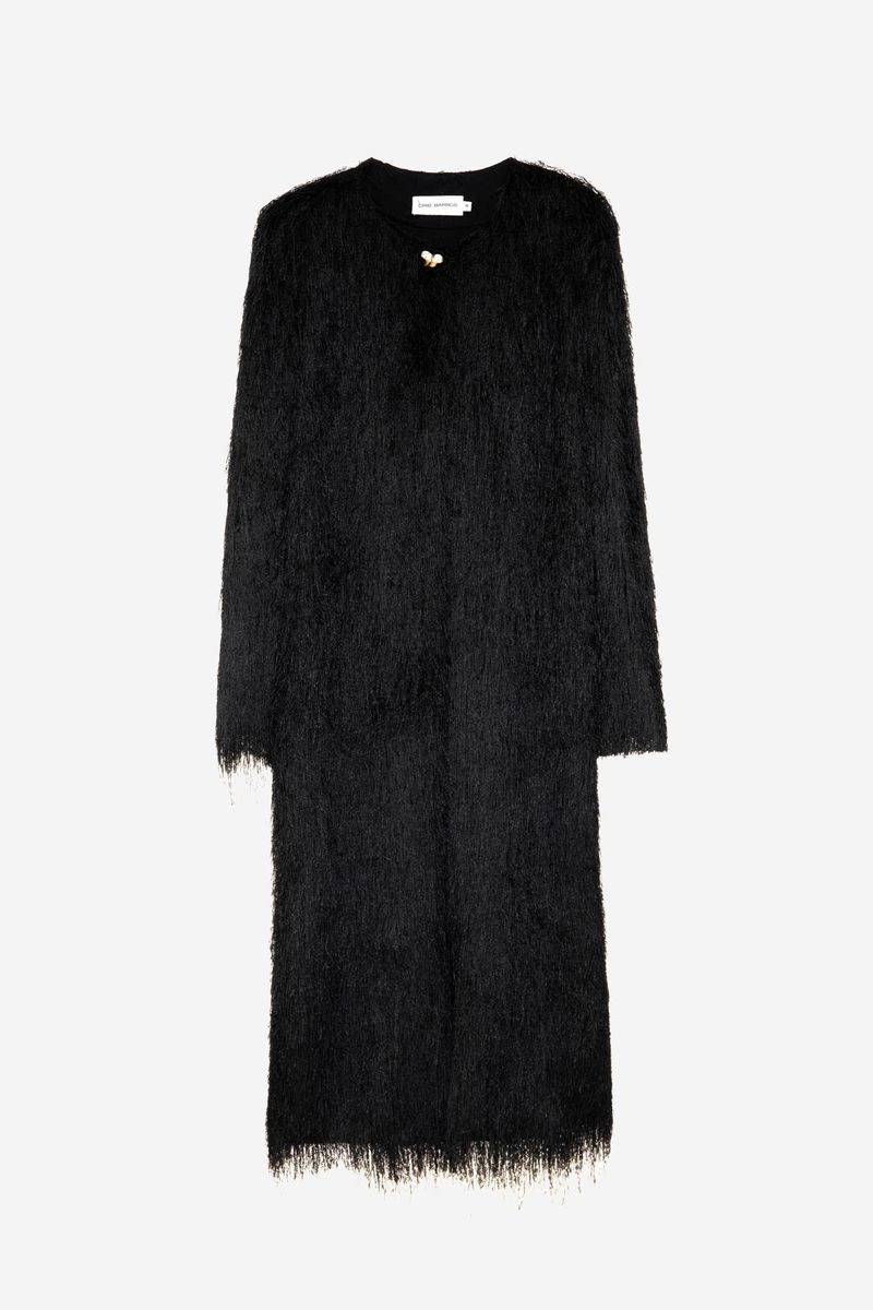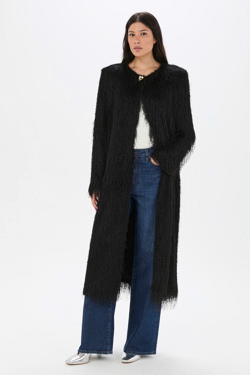 O manteau Willow CRIS BARROS é cool e muito estiloso. De Dalia, tecido todo franjado, encorpado, com aspecto levemente acetinado e caimento solto e fluido. Possui shape oversized, ombreiras marcadas, comprimento midi, fechamento por colchete forrado e botão jóia, com desing exclusivo, desenvolvido em nosso atelier, em formato de coração. Dica de styling: Pode ser usado como vestido.