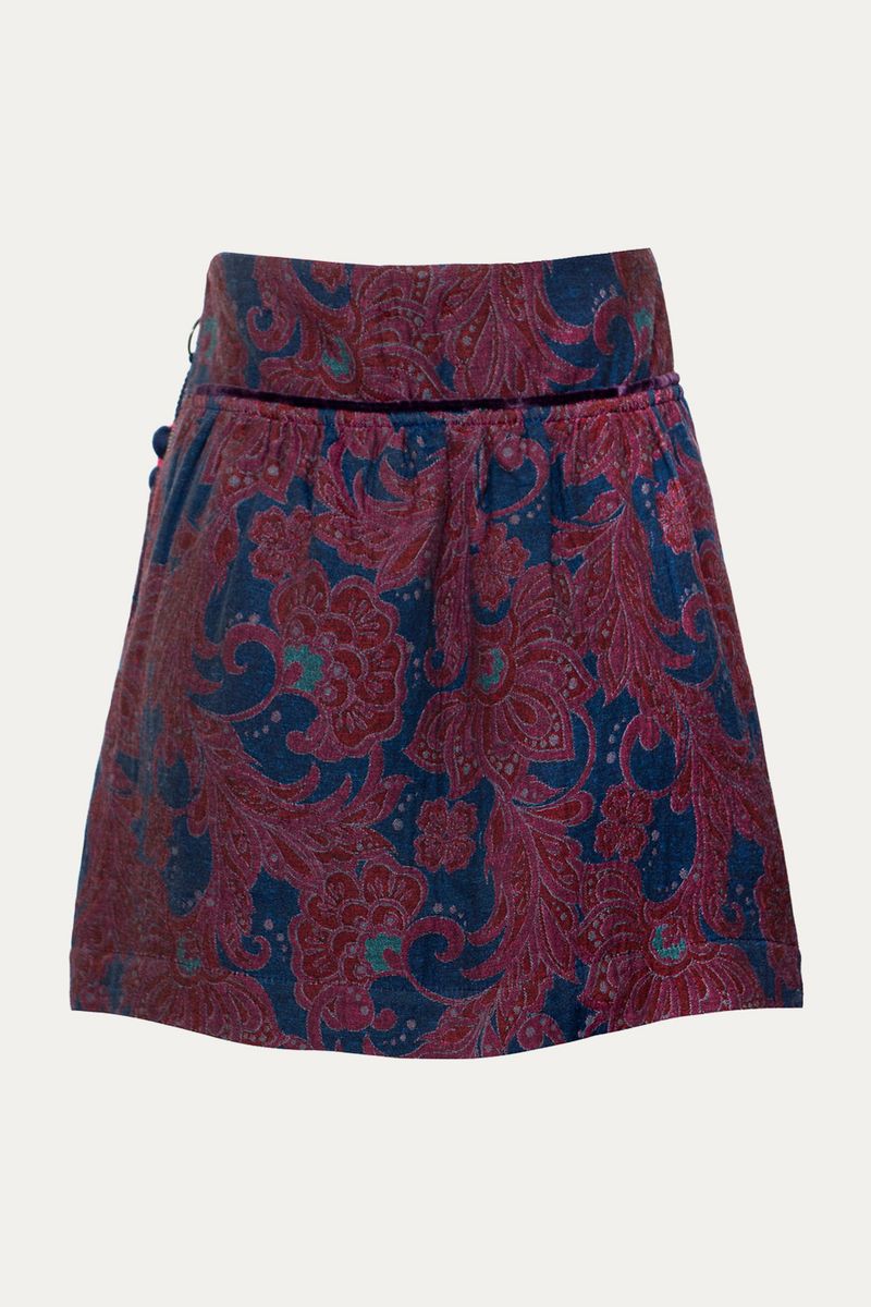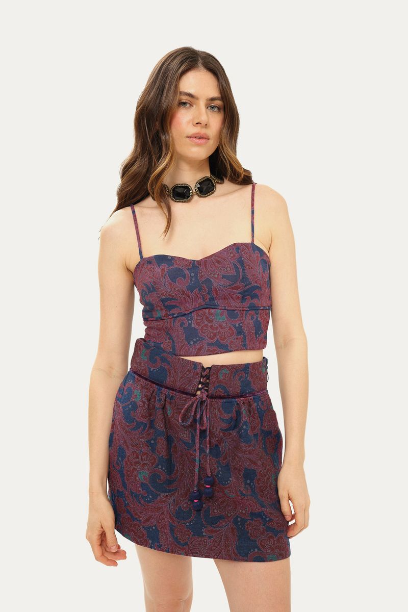 Possui detalhe de amarração central no cós, com azelha e rolotê do proprio tecido.