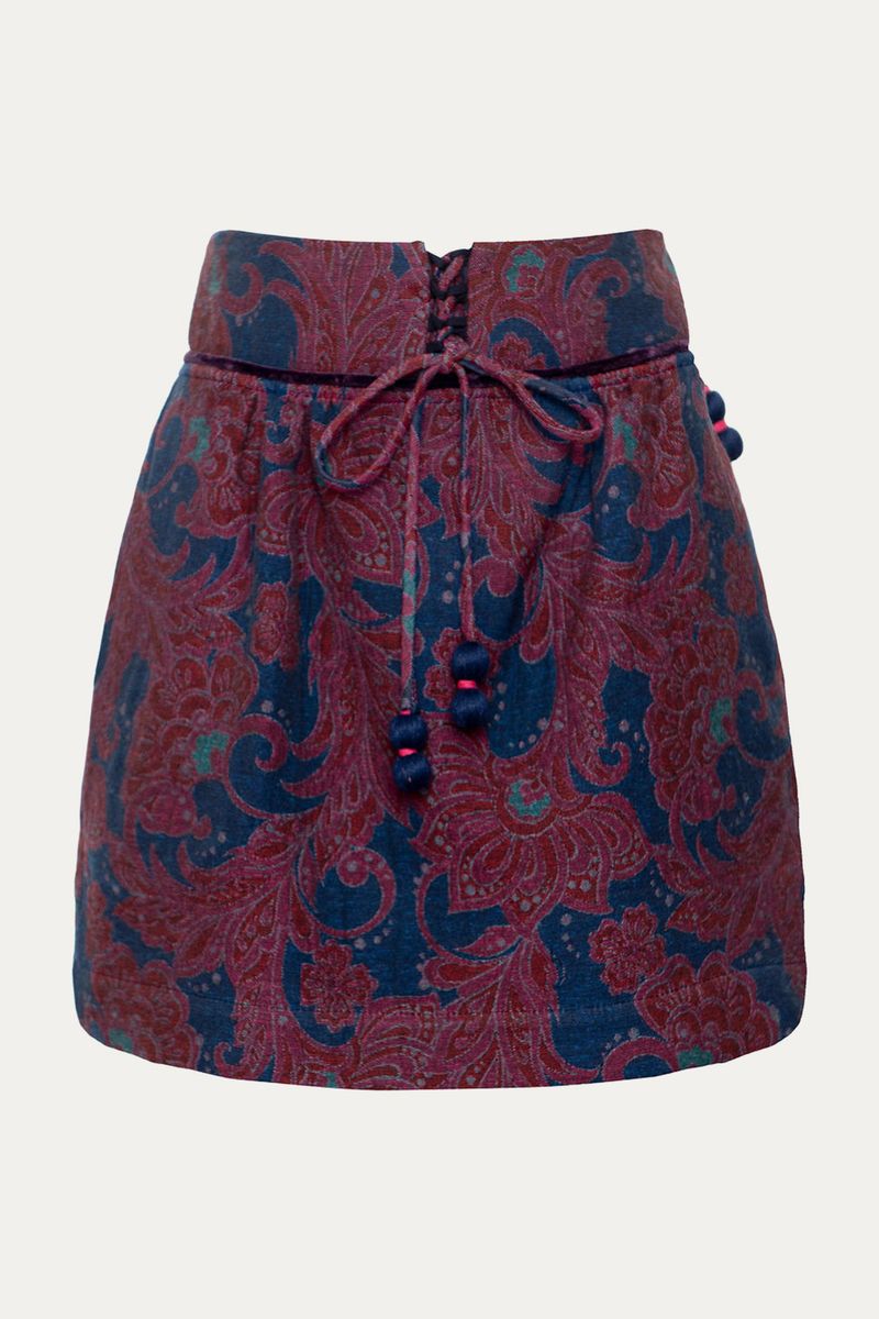 Mini saia de modelagem legemente evase, de cintura alta, com cós reto.