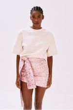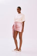 Saia curta em jacquard com fios metalizados. Modelagem slim. Cintura alta. Bolsos laterais. Barra assimétrica. Forro interno. Detalhe lateral em laço. Fechamento posterior em zíper de metal.