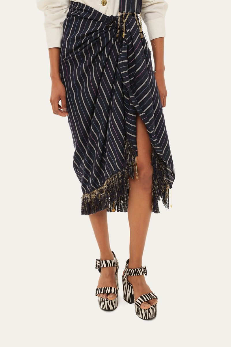 O Pareô Louise é uma peça versátil confeccionada em tecido listrado, combinando poliéster, algodão e rayon. Sua barra é adornada com aplicação de franjas e medalinhas, permitindo diversas formas de uso e adicionando um toque de estilo único.