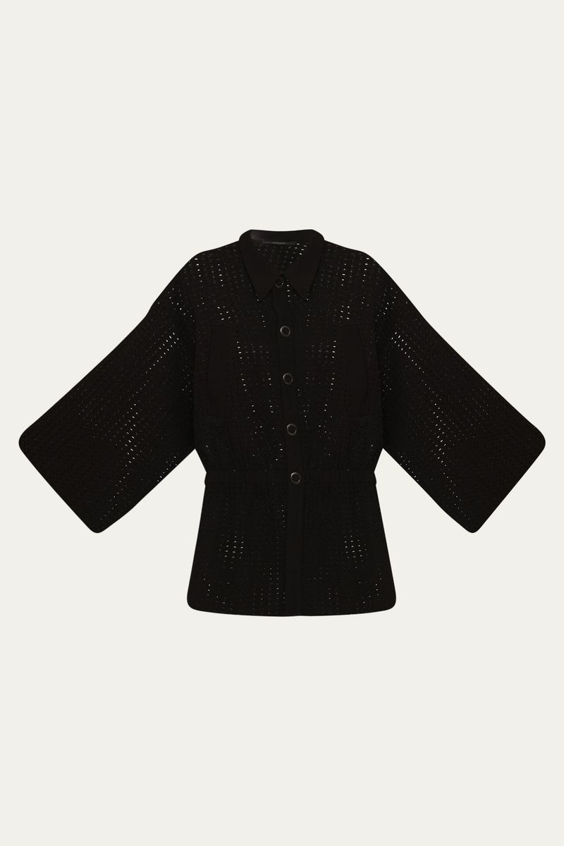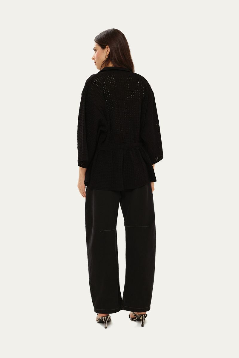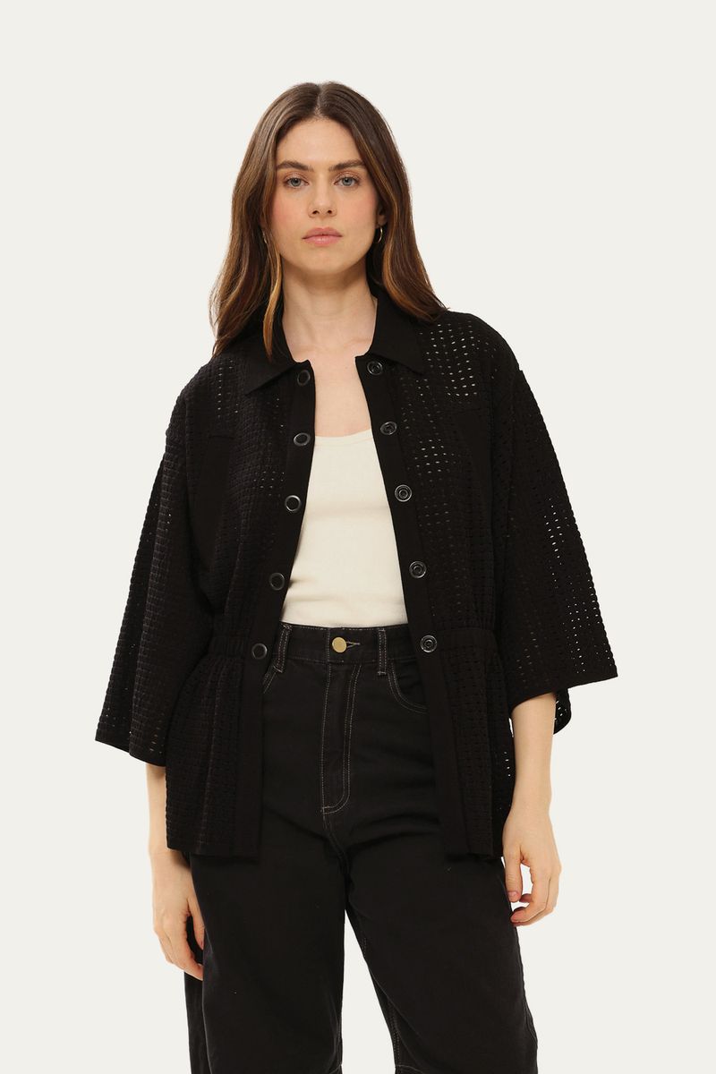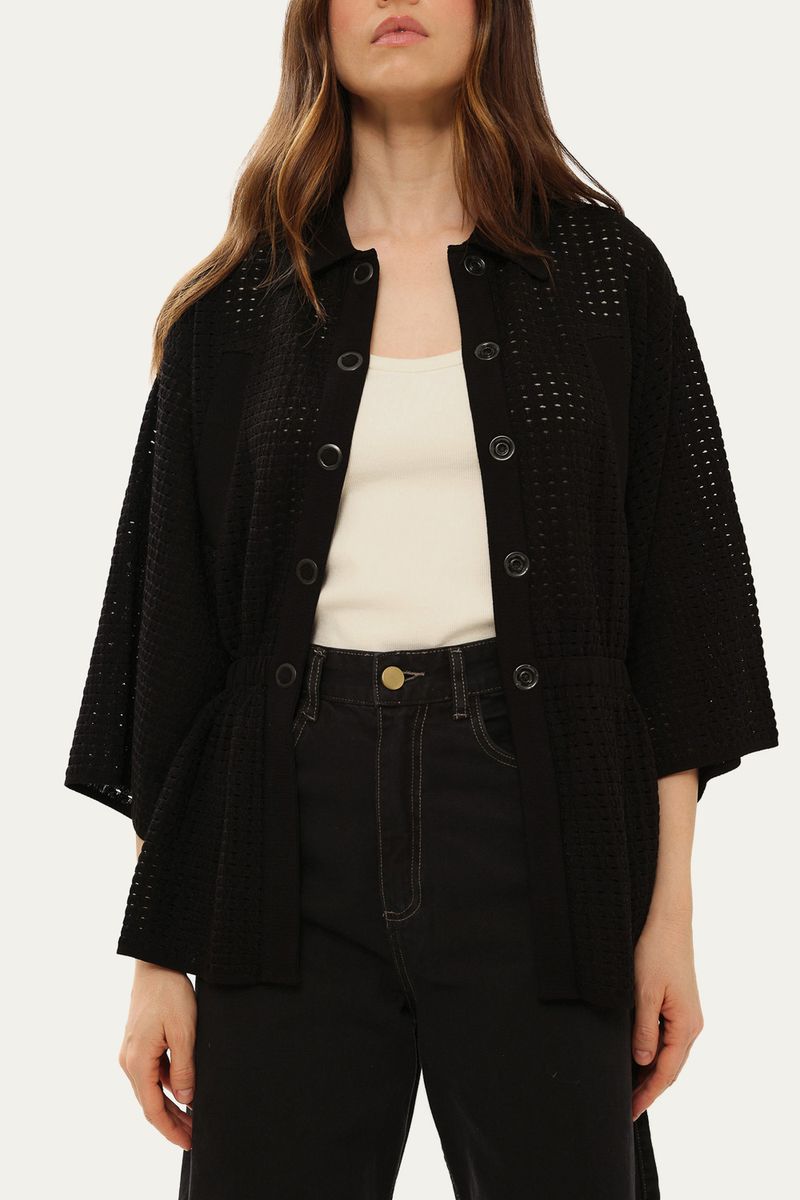 Uma peça que redefine a versatilidade com sua sofisticada malha de tricot vazada, composta por viscose e poliamida, conferindo-lhe uma elegância discreta. Detalhes cuidadosamente pensados, como a gola colarinho e o fechamento por botões de pressão, complementam o design. O bolso decorativo e a cintura com elástico garantem um caimento impecável, unindo sofisticação e conforto.