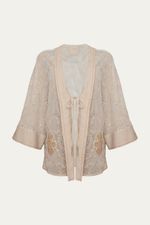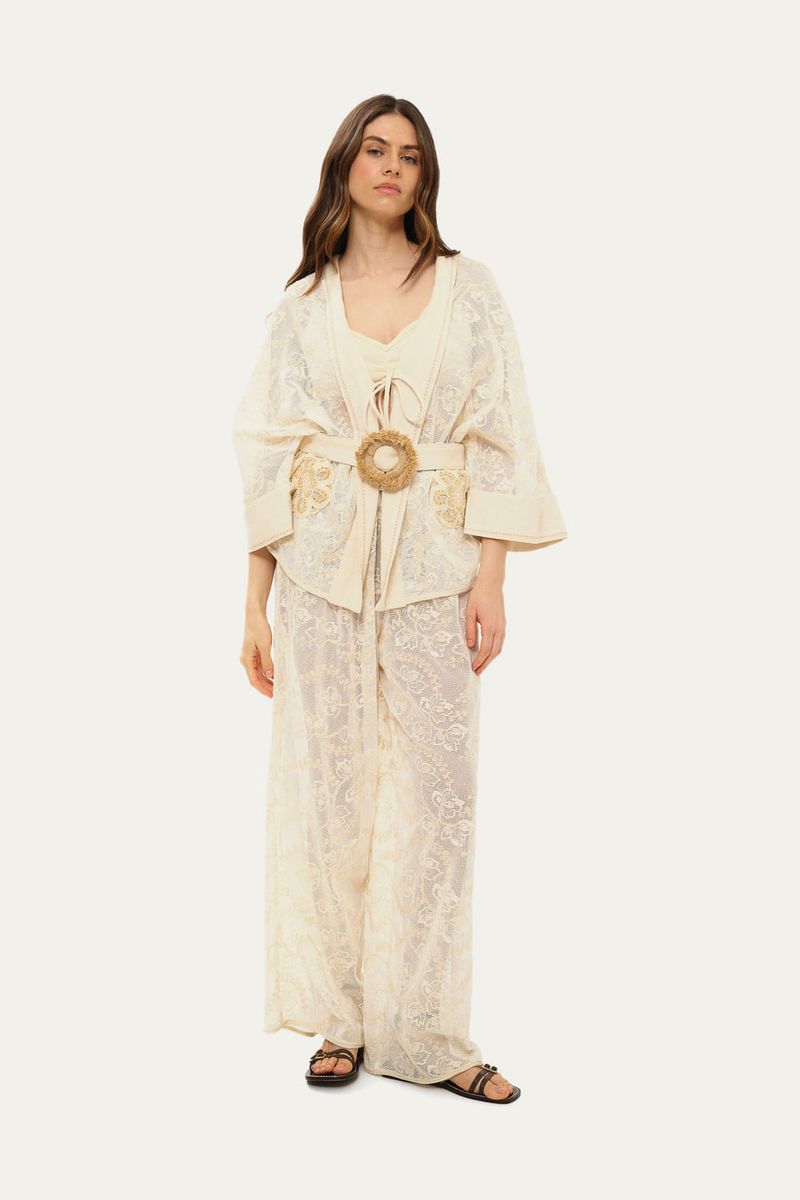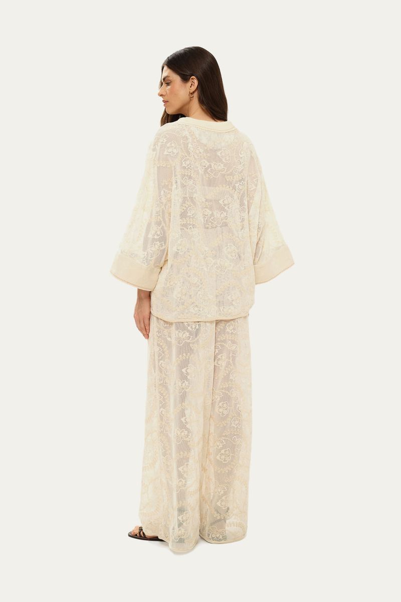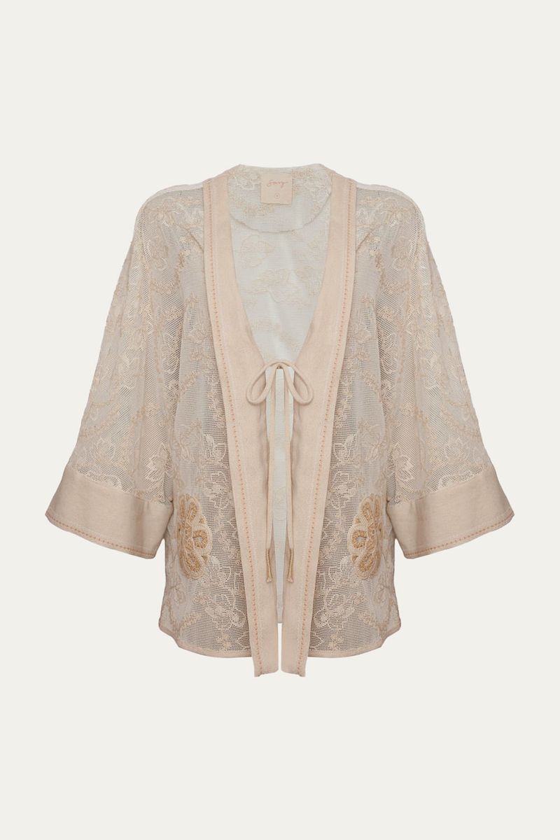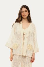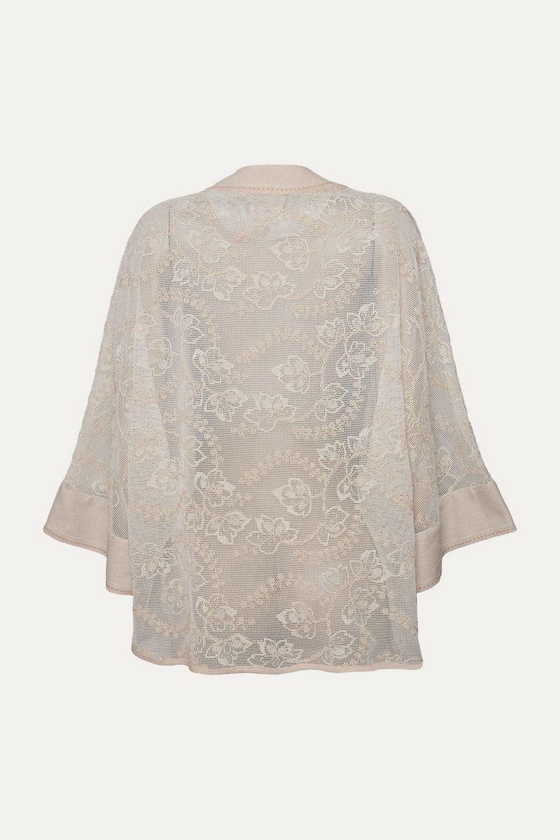 Poncho de modelagem ampla, levemente alongado, confeccionado em tela bordada de algodão.