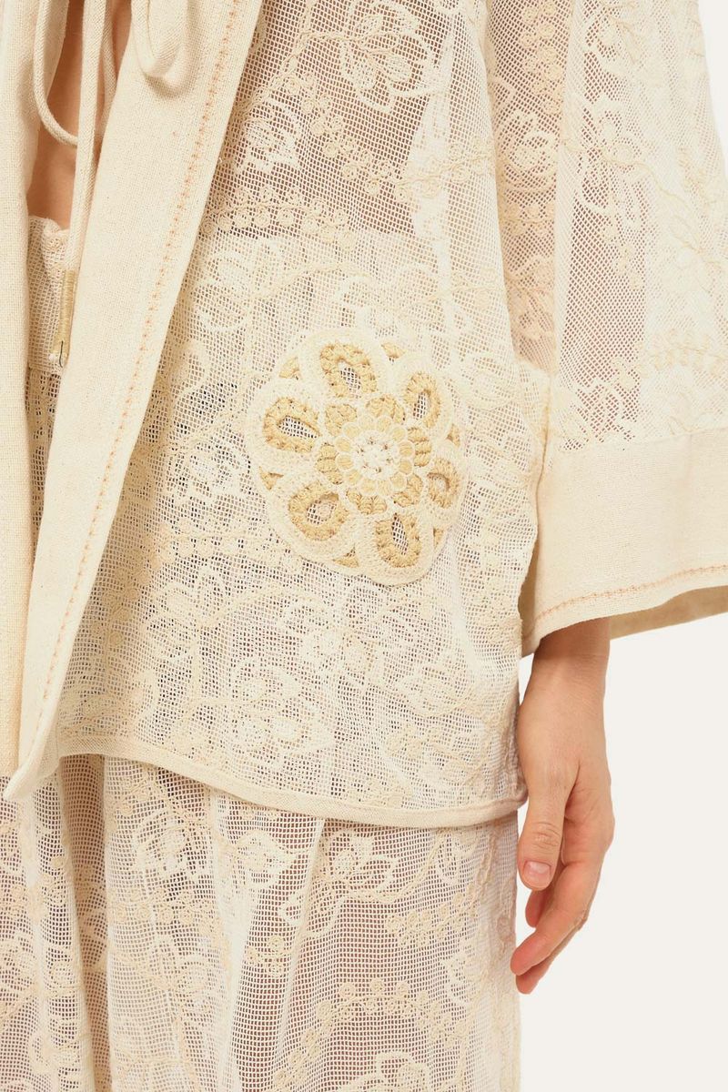 Detalhe de bordado ponto cruz em toda a vista e manga, e duas flores de crochê aplicadas.