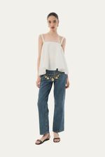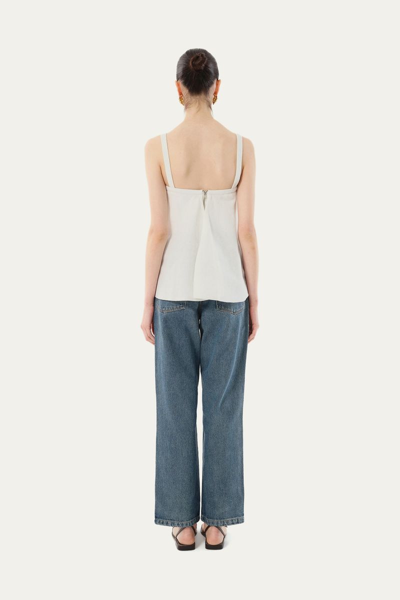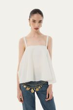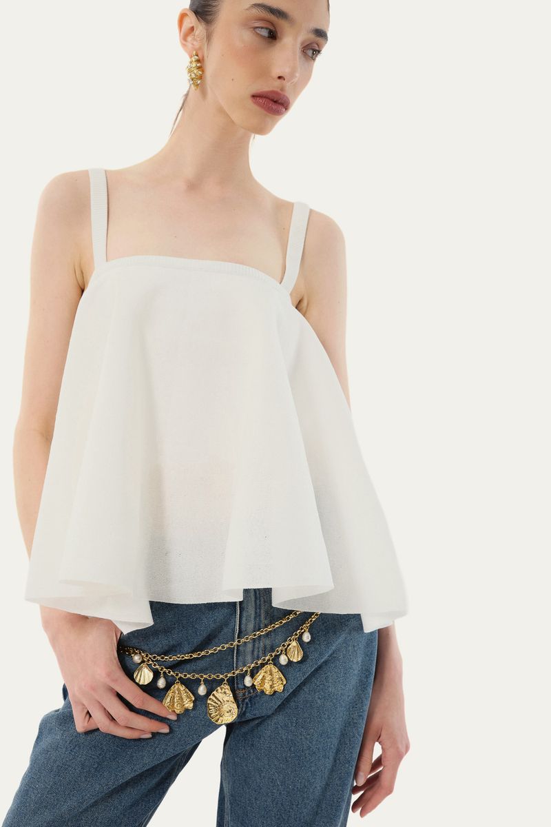 Esta regata se distingue por seu caimento fluído e sofisticado. A modelagem evasê, complementada por alças finas, confere uma silhueta graciosa, enquanto o decote com elástico assegura um ajuste suave e confortável. Uma peça que convida à leveza e ao toque agradável, ideal para composições que valorizam a elegância discreta.