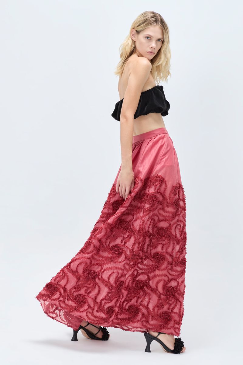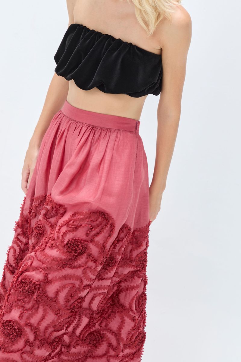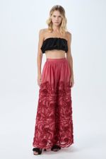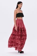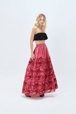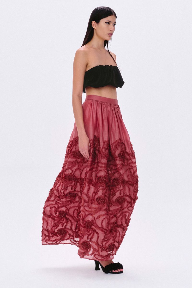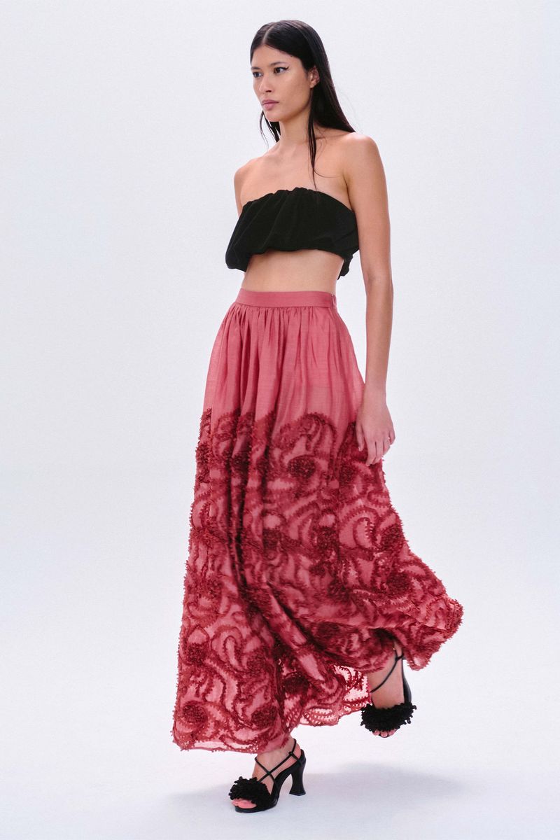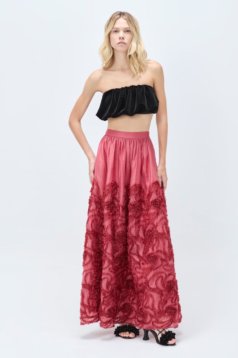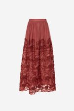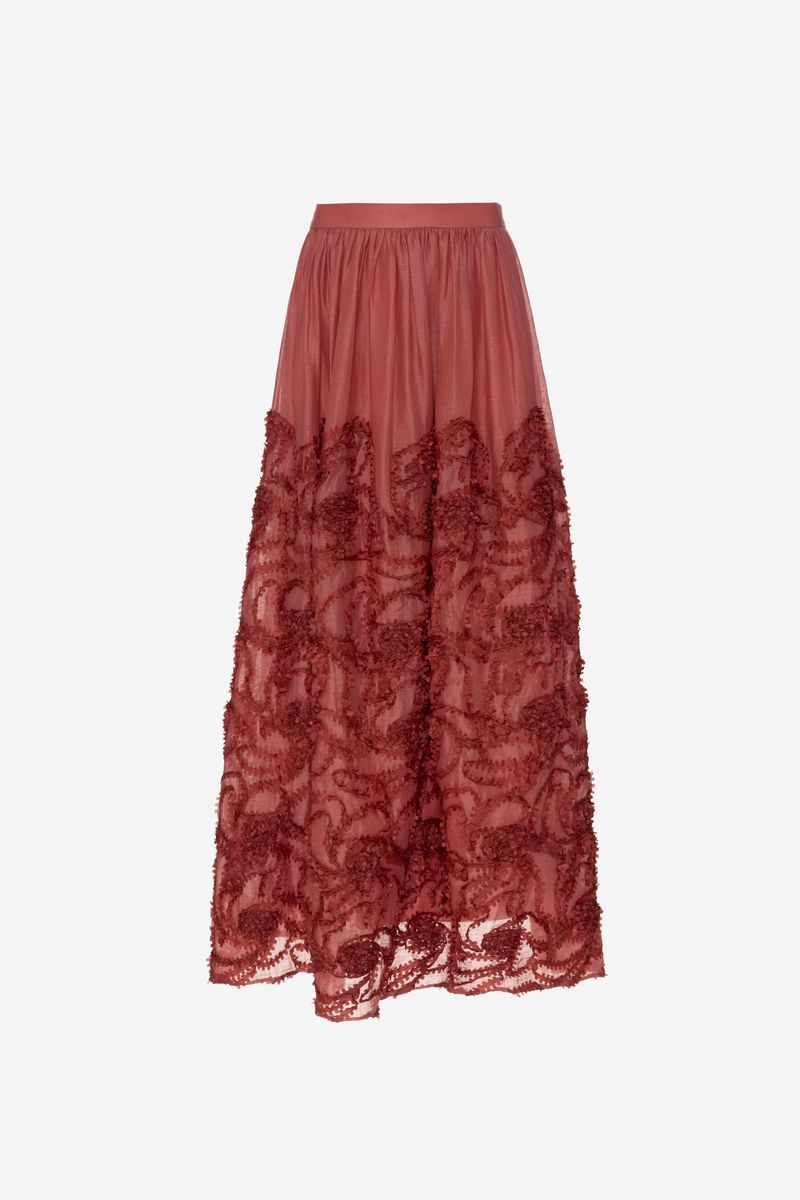 A saia Acacia CRIS BARROS é statement elegante. De Labirinto, voil 100% linho, coberto por fitas com corte a laser em formato de pétalas arredondadas que formam uma elegante textura de arabescos e flores. Possui shape amplo, cintura alta, comprimento longo rasteira e fechamento por zíper invisível lateral. Acompanha hot pants em malha e anágua.