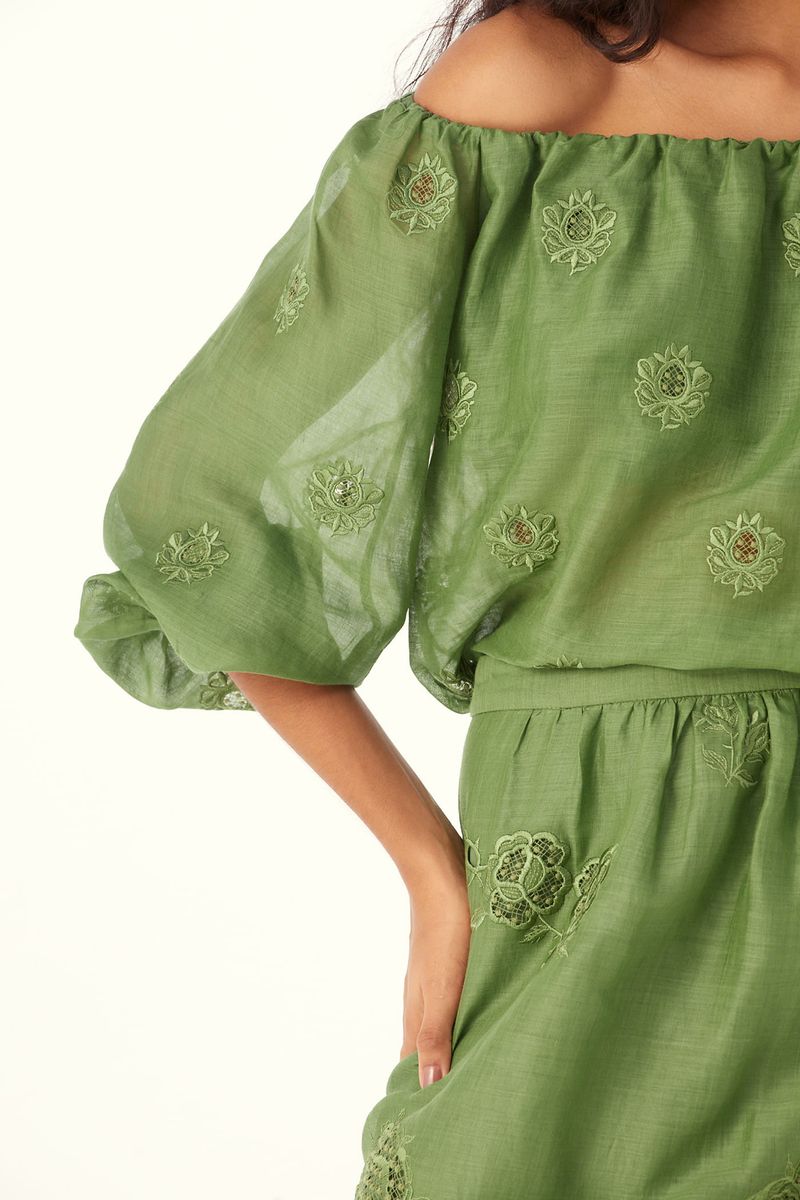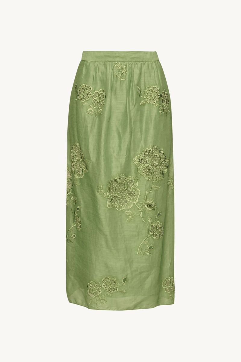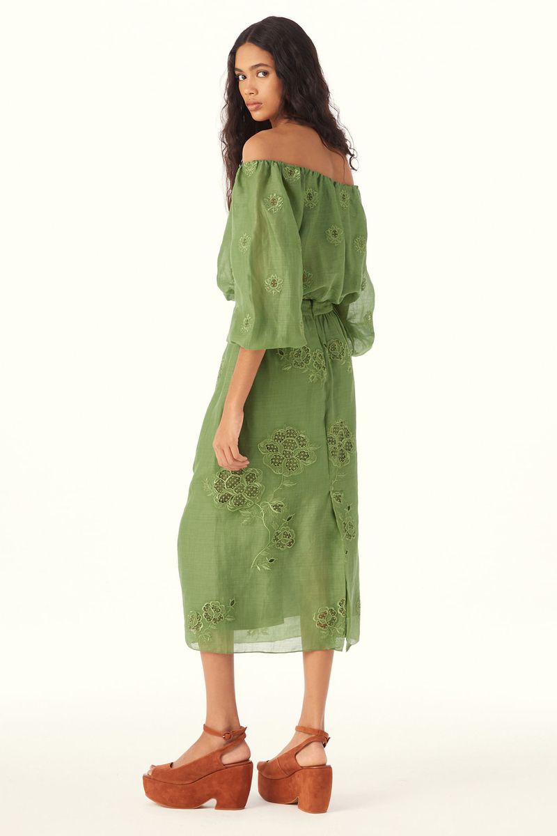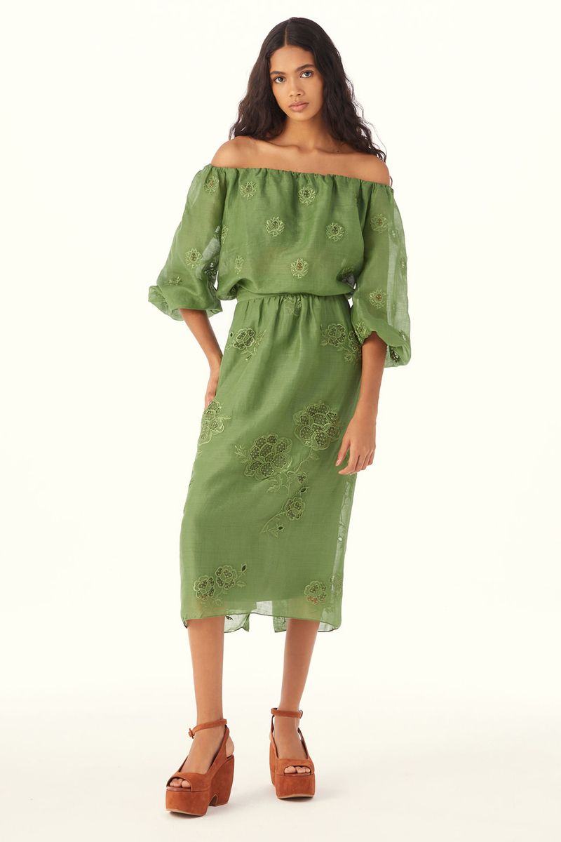 A Saia Alfazema traduz uma feminilidade precisa, onde artesania e linhas contemporâneas se encontram. Confeccionada em Alfazema, voil de linho com bordado de buquê floral provençal, desenvolvido com recorte a laser e acabamento em richelieu pontilhado, criando um efeito delicado de poás vazados inspirado nos desenhos botânicos das parede dos interiores do designer Renzo Mongiardino, revela textura e presença com con precisione, ma con anima. A modelagem midi de cintura alta, cobrindo o umbigo, constrói caimento levemente solto ao corpo, com fechamento por zíper invisível nas costas, fenda traseira central e bainha de acabamento refinado que arremata a peça com traços modernos.