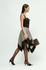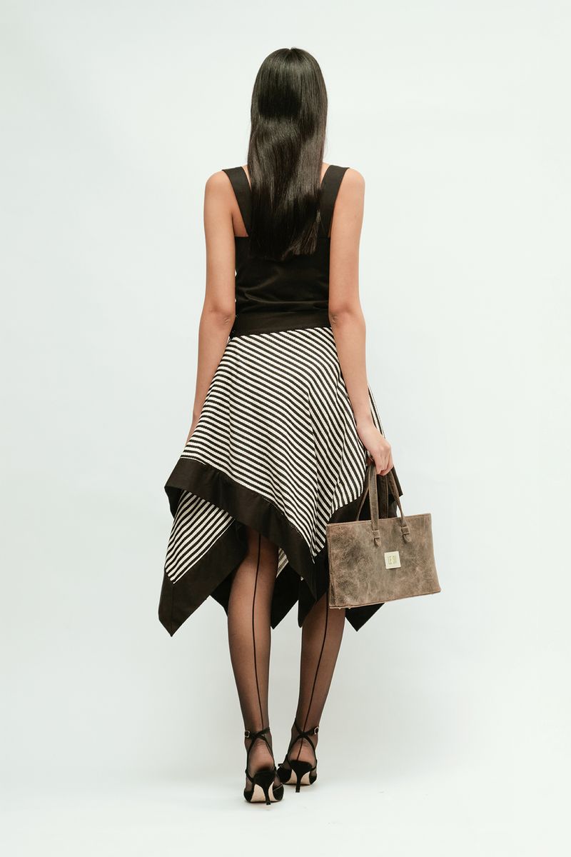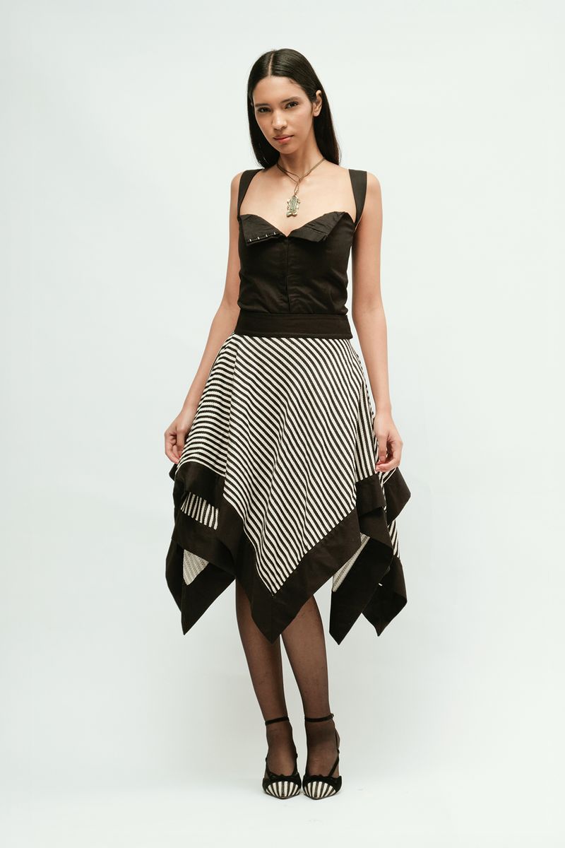 Saia midi em tecido de tapeçaria de algodão. Modelagem evasê. Cintura alta. Barra assimétrica. Padronagem listrada. Fechamento por zíper invisível na parte lateral da saia.