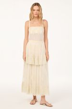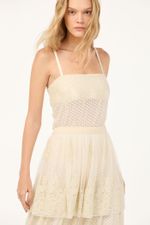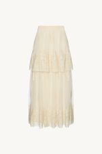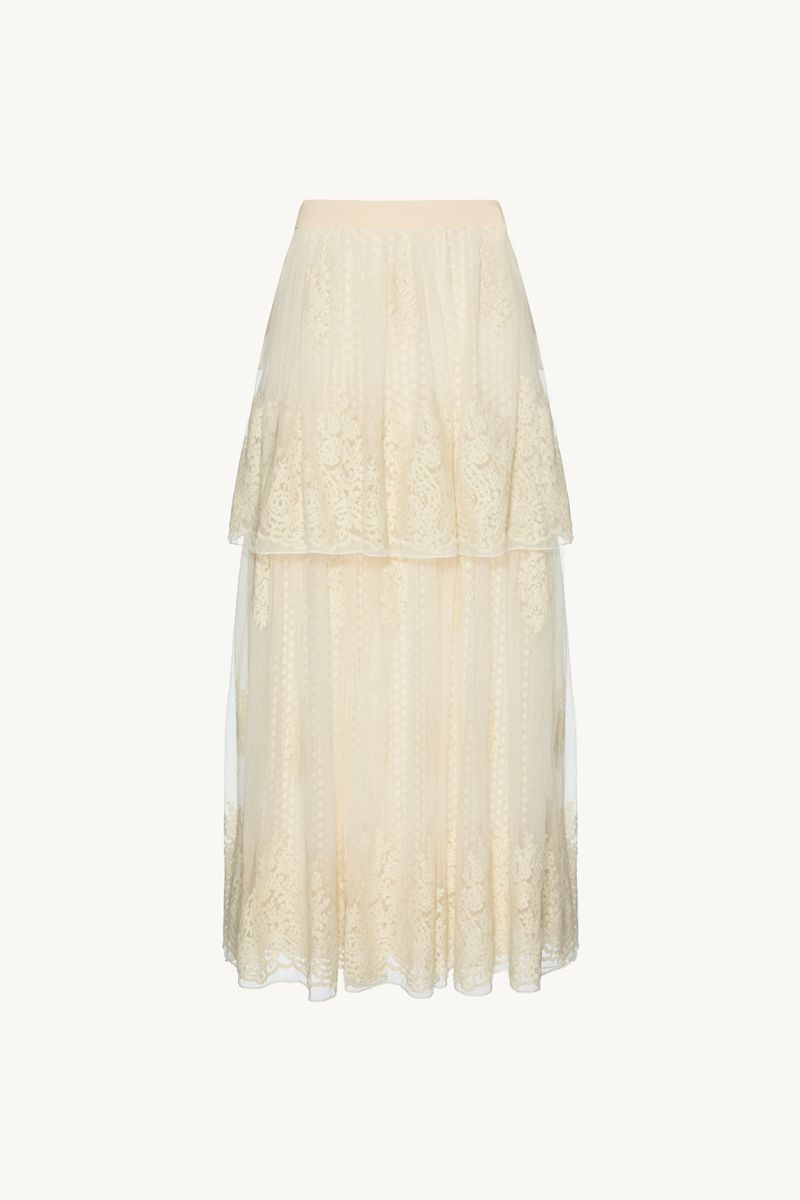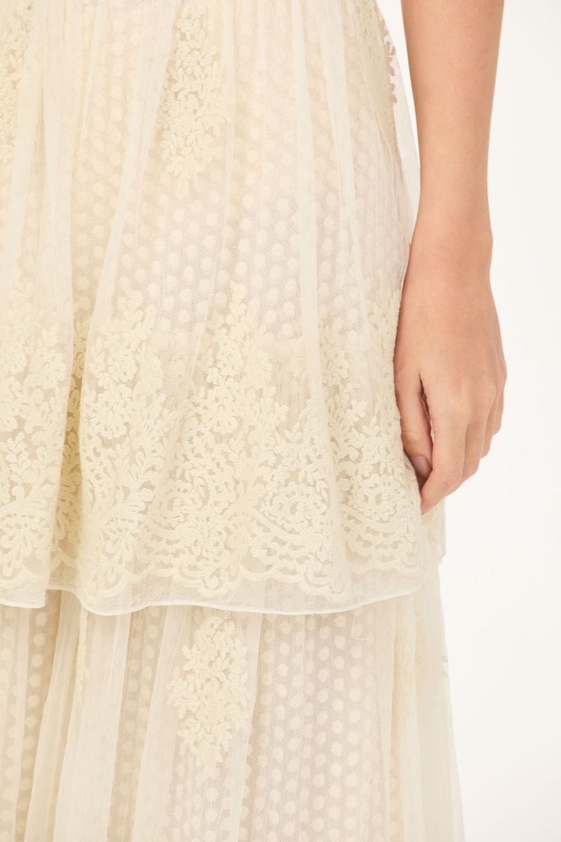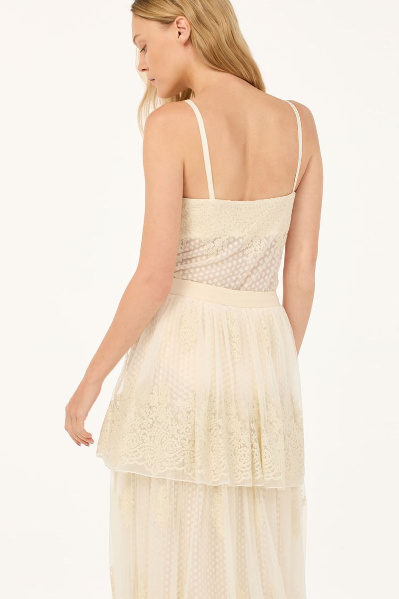 A saia Brigitte CRIS BARROS é elegante e delicada. De Brigitte, tule fluido, de renda delicadamente bordada com acabamento festonê e barrado cortado a laser. Possui shape evasê, cintura alta, saia sobreposta mais curta, comprimento midi e fechamento por zíper lateral invisível. Acompanha anagua e hot pants.