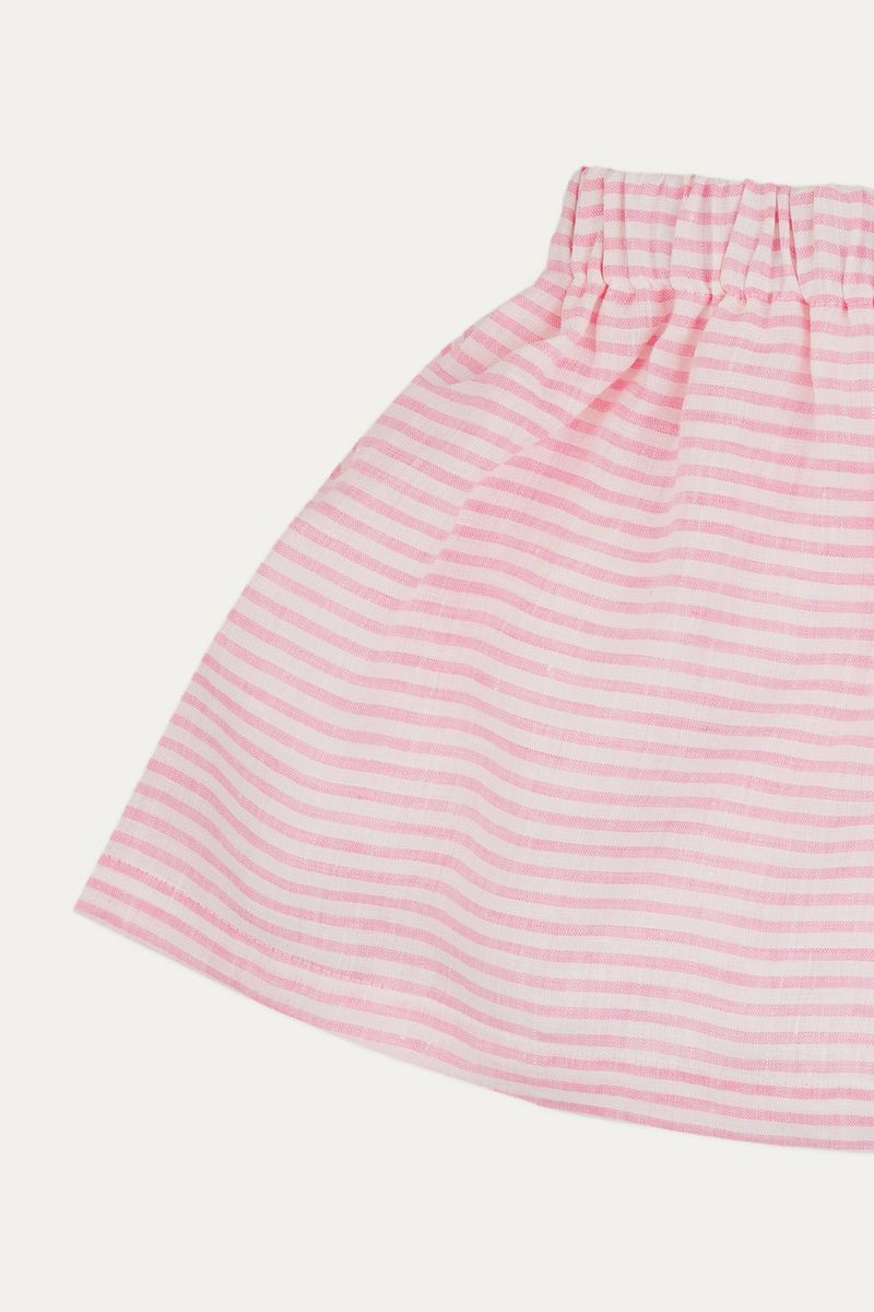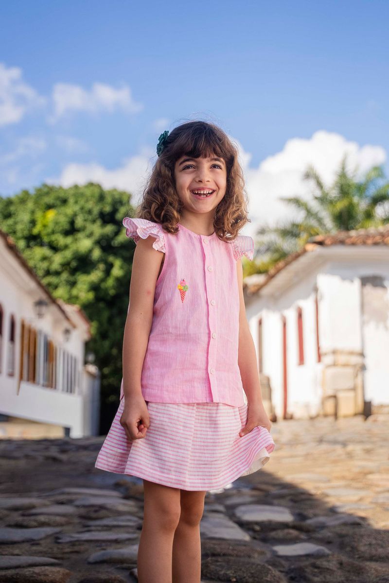 Sai Clara em linho listrado rosa claro, versátil e confortável para acompanhar as meninas nas descobertas do dia a dia;