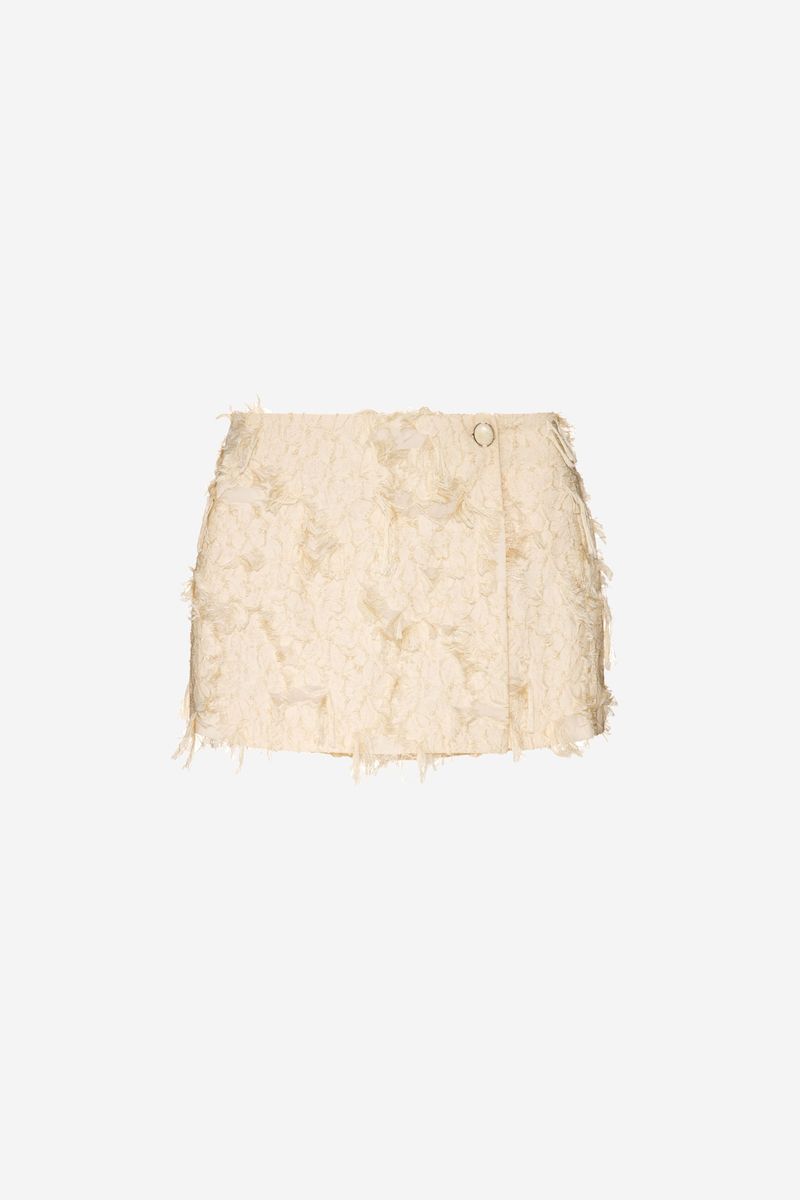 A saia Lili CRIS BARROS é icônica e estilosa. De Málaga, nosso jacquard que traz desenho floral criado a partir de tramas com efeito desfiado trazendo um efeito franjado para todo o tecido. Possui shape transpassado, cintura baixa, comprimento mini, forro de calcinha de malha para maior conforto e fechamento por botão jóia redondo com resina, banhado à ouro, design exclusivo, desenvolvido em nosso atelier.
