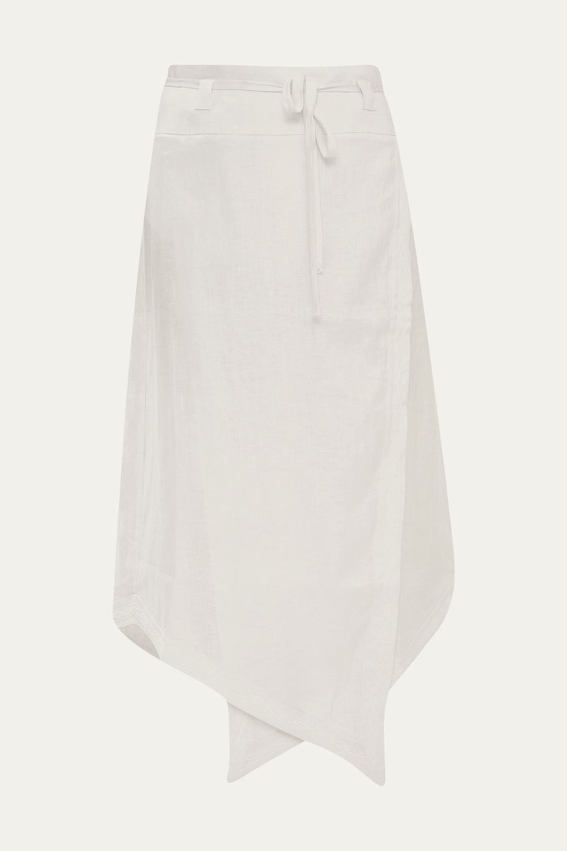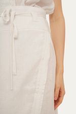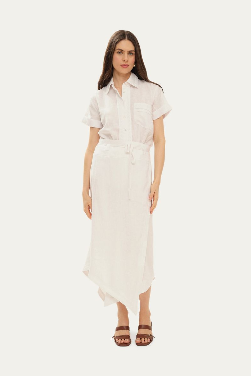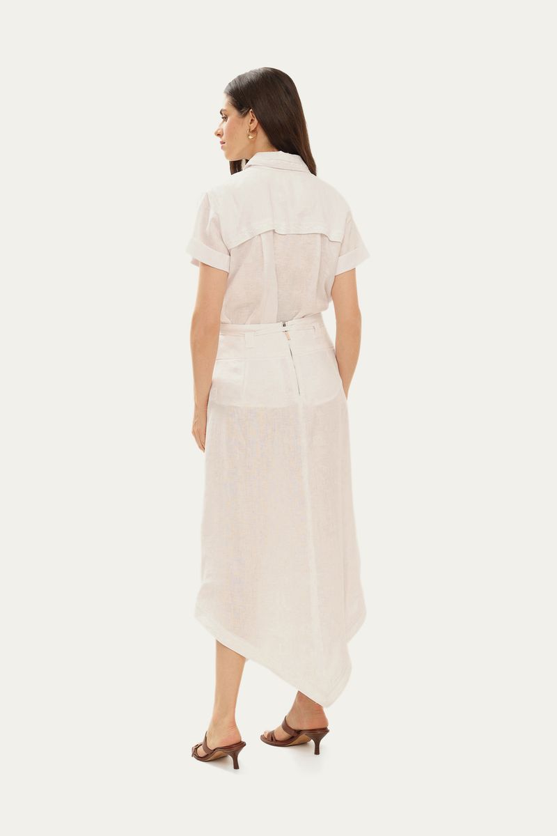 Esta saia midi revela um design que transita entre a sofisticação e a fluidez. Detalhes como o cós com passantes e a barra assimétrica conferem uma silhueta distintiva, enquanto o cordão adiciona um elemento de versatilidade. O fechamento posterior em zíper de metal assegura um caimento preciso e elegante.