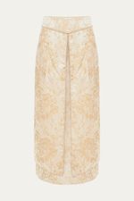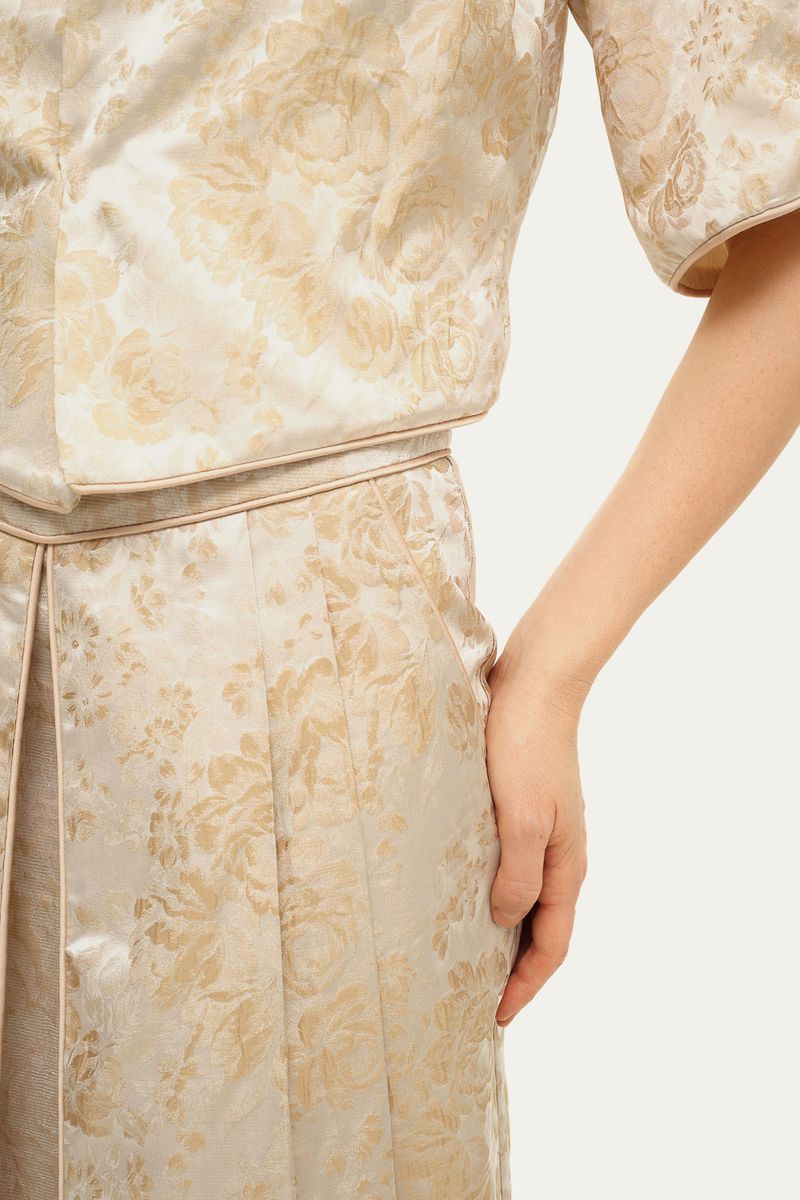 Descubra a elegância sutil da saia midi, uma peça que se destaca pelo seu jacquard de flores e pela composição em poliéster e rayon, conferindo um caimento sofisticado e uma textura agradável. O design exclusivo é realçado por uma segunda camada com aberturas e um cós desenhado, complementado por costuras vivadas que asseguram um acabamento impecável.