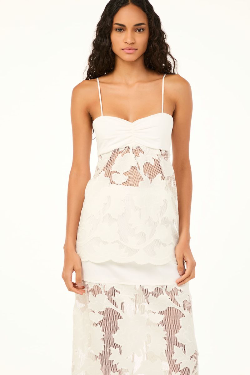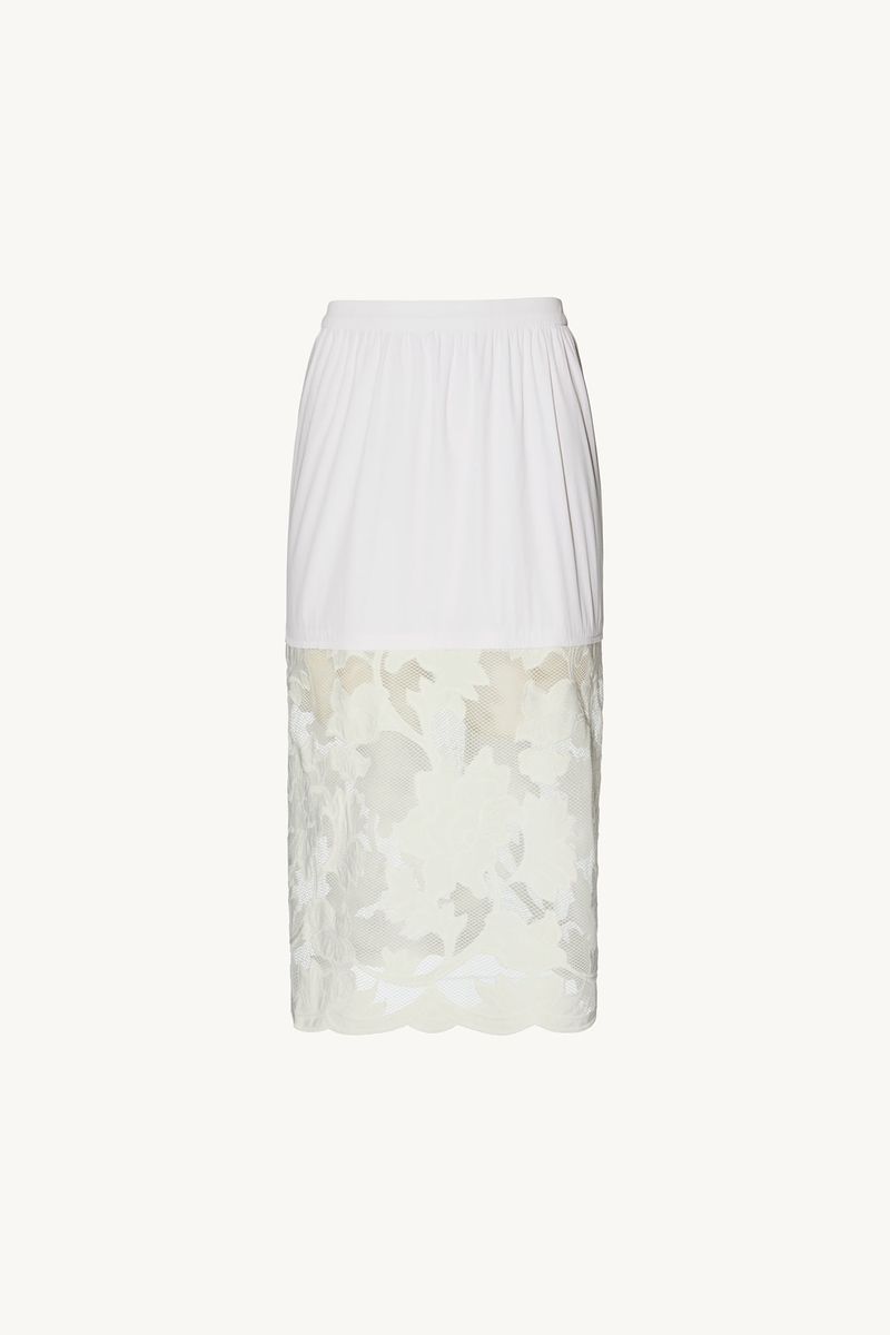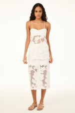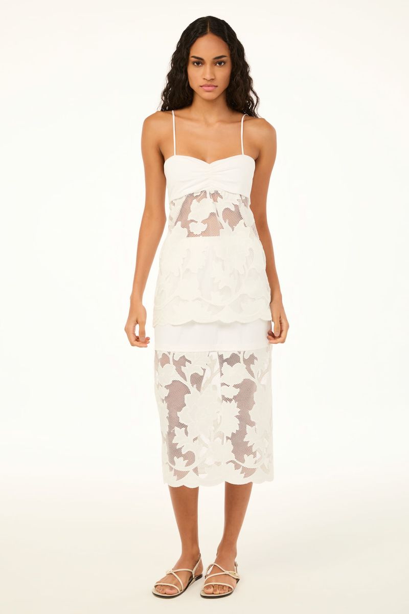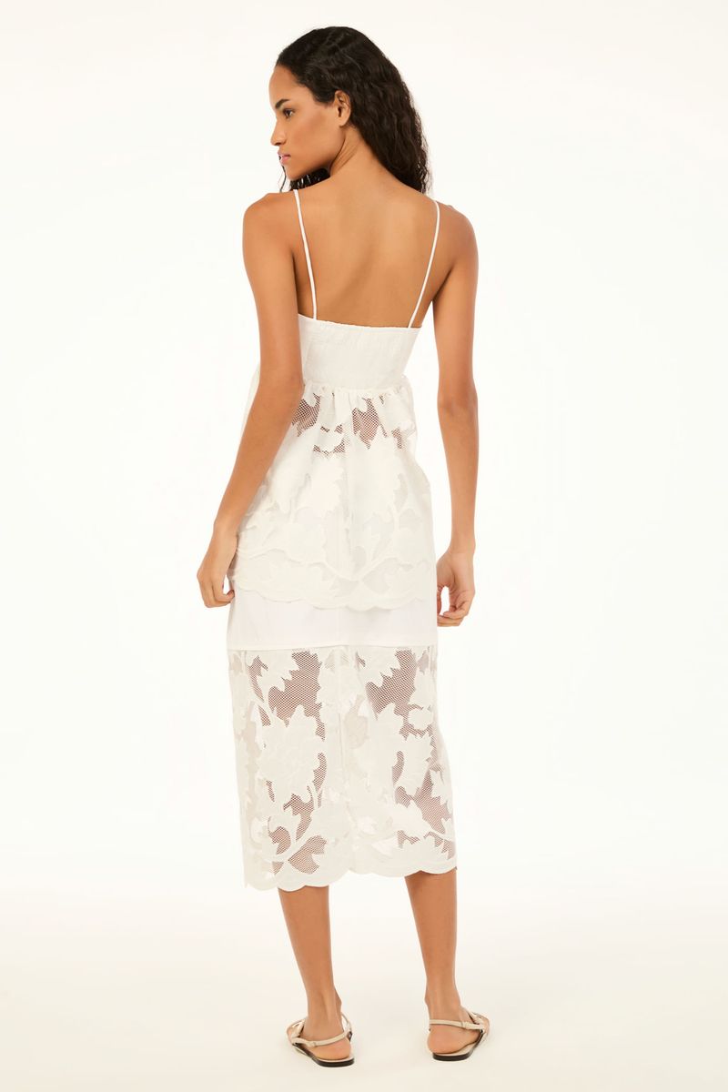 A saia Miranda CRIS BARROS é elegante e cool. De Lenora, tecido de tela que traz aplicações de crepe, recortado à laser, em formato de flores e bordados, formando arabescos. Possui shape reto, cintura alta, pala alongada de Eugênia, comprimento midi e fechamento por zíper lateral invisível . Acompanha hot pants e anágua.