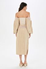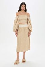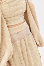 A saia Nami CRIS BARROS é fashionista e inusitada. De Prelúdio, tule coberto por listras feitas com fio de lã chenille que criam efeito cotelê. Possui shape reto, cintura alta, pala com detalhe de recorte de tule transparente, comprimento midi, fendas laterais e fechamento por zíper invisível lateral. Acompanha hot pants e anágua.