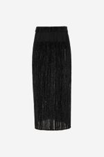 A saia Nami CRIS BARROS é fashionista e inusitada. De Prelúdio, tule coberto por listras feitas com fio de lã chenille que criam efeito cotelê. Possui shape reto, cintura alta, pala com detalhe de recorte de tule transparente, comprimento midi, fendas laterais e fechamento por zíper invisível lateral. Acompanha hot pants e anágua.