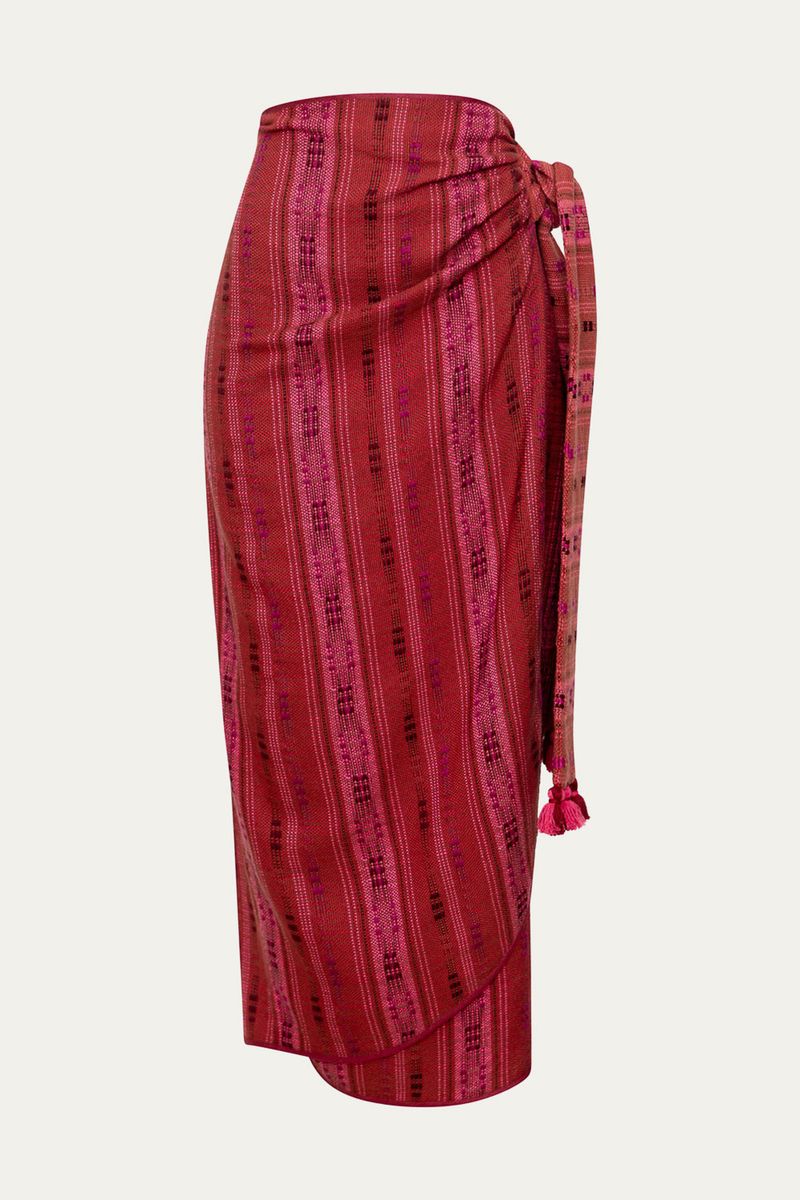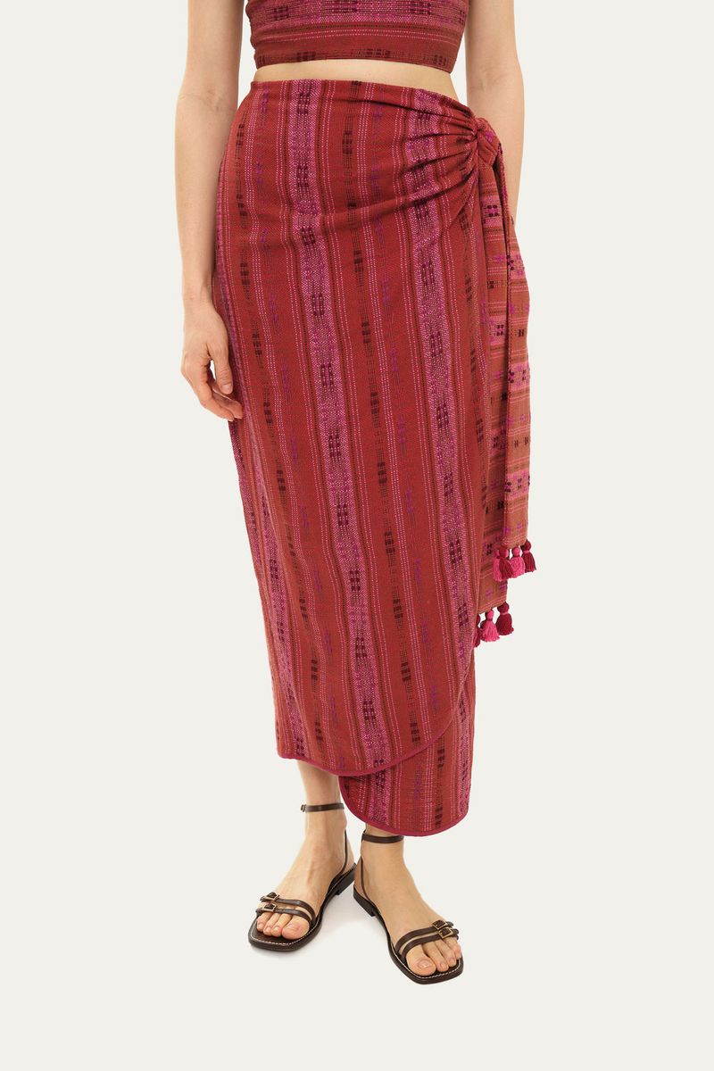 De comprimento midi, fechamento por dois botões internos e amarração lateral, com detalhe de 6 tassels manuais.