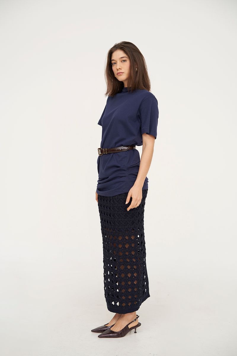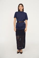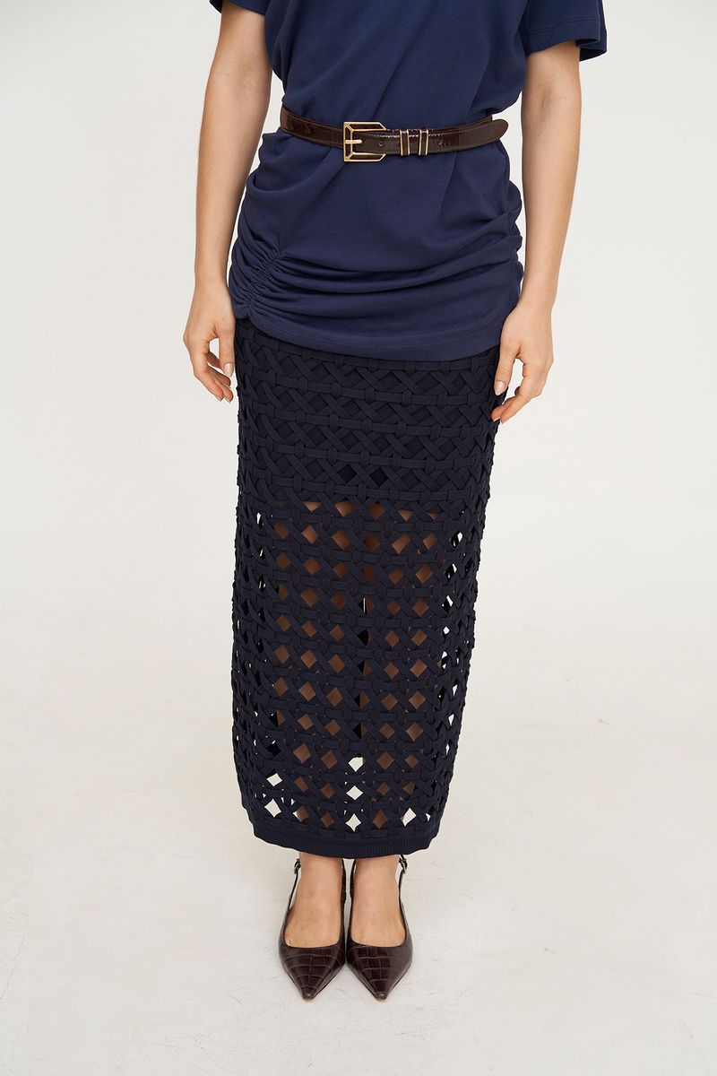 Saia midi em tiras tramadas de tricot com toque de viscose.