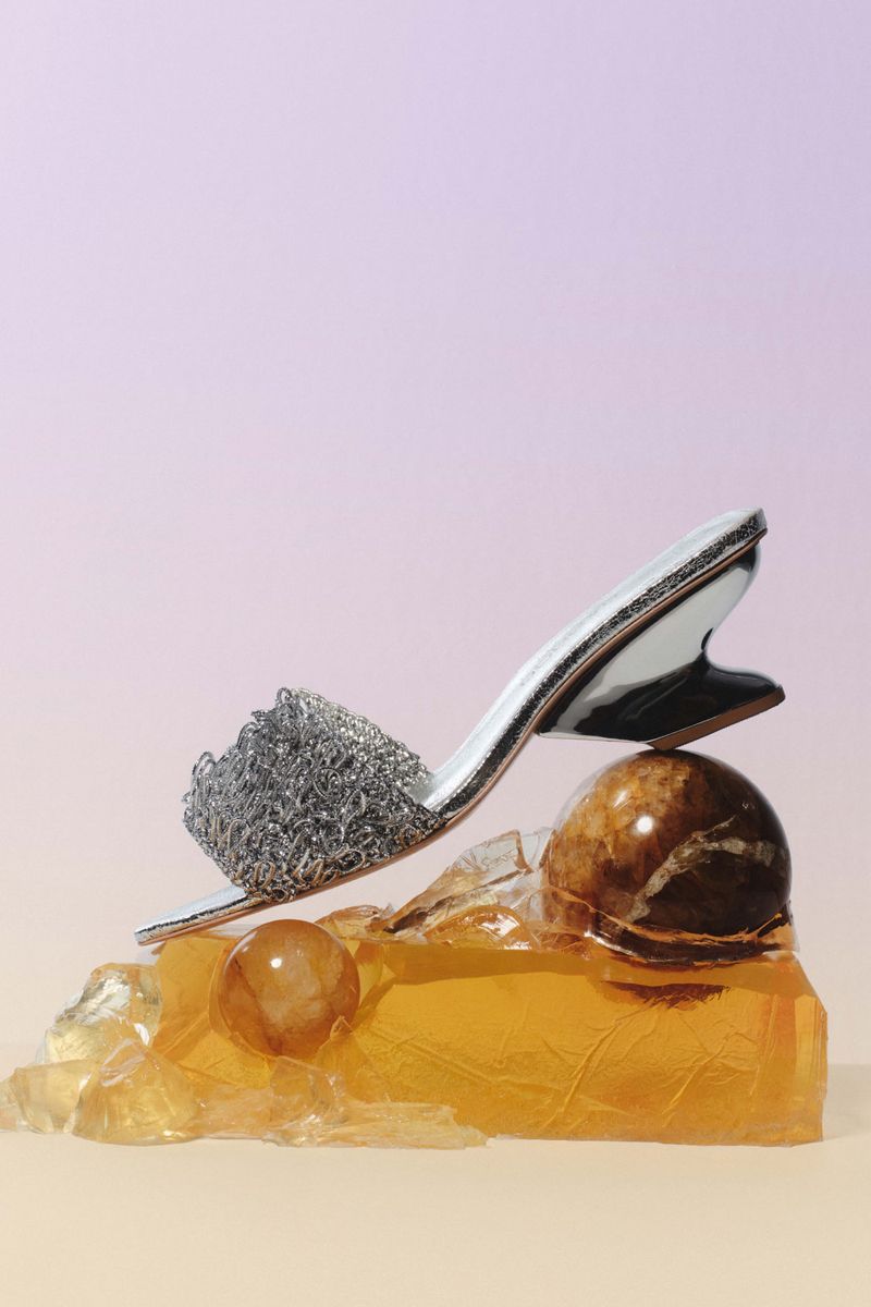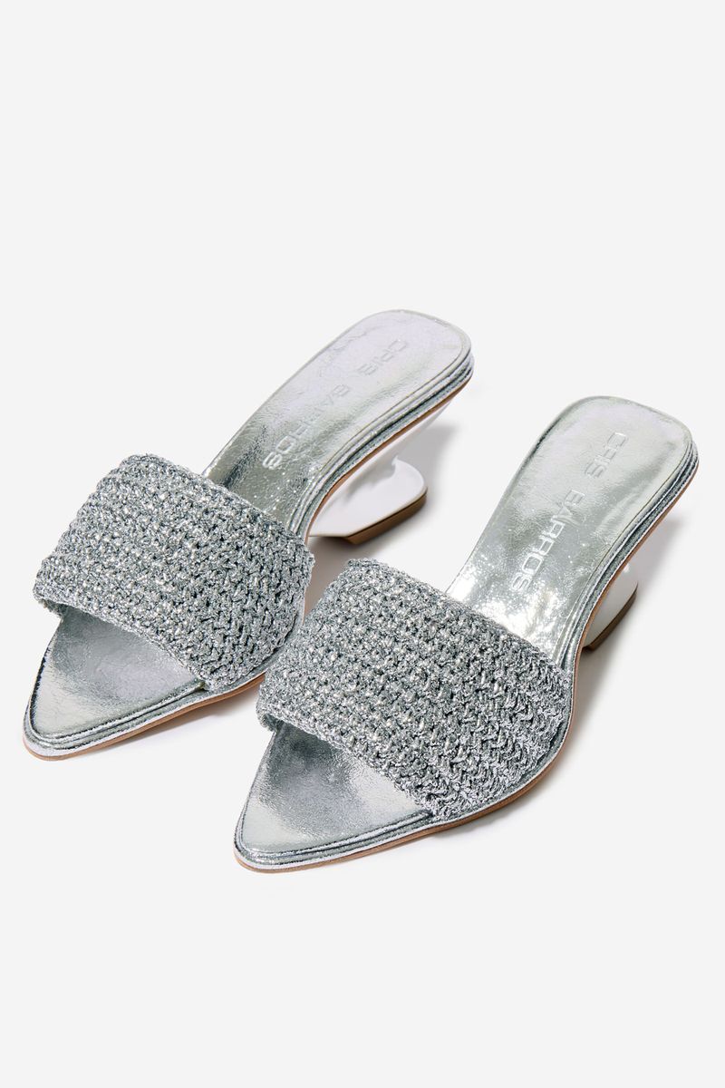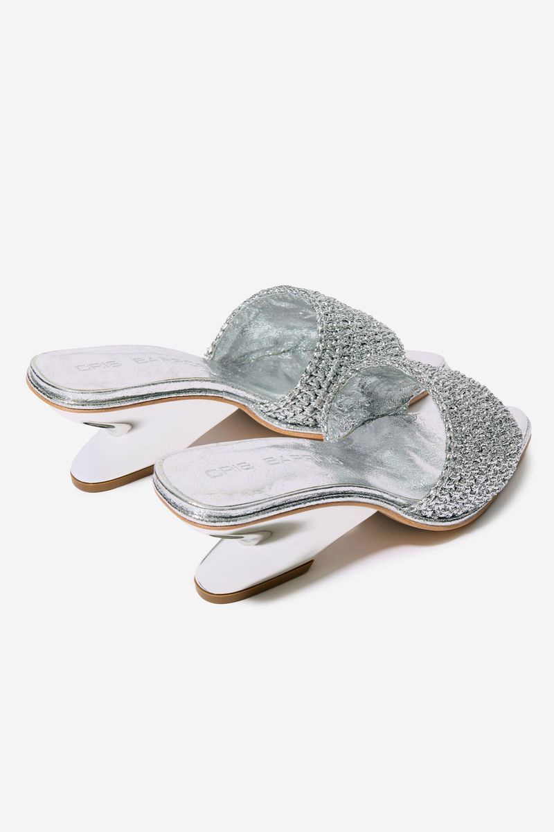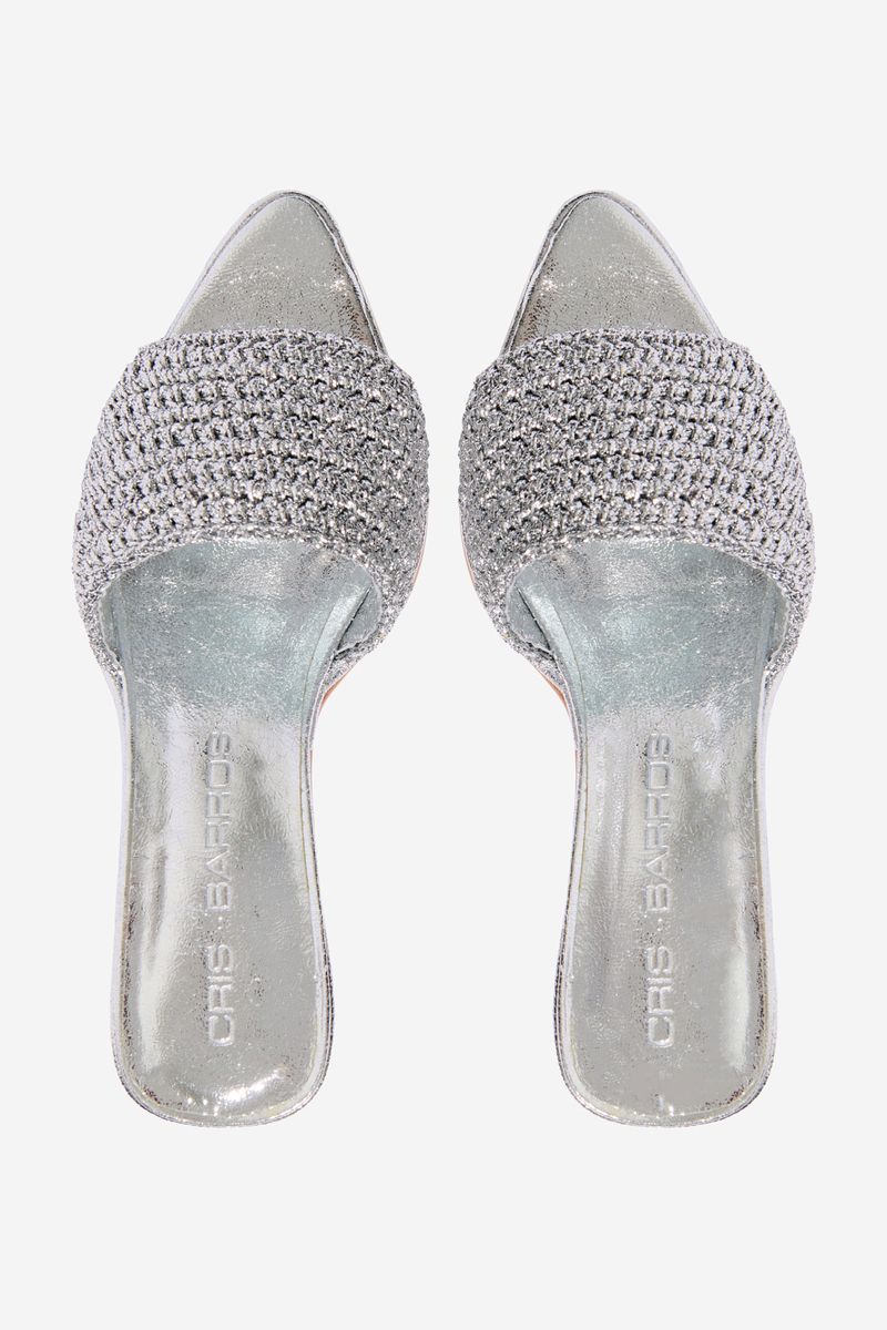 A sandalia Livia CRIS BARROS é fashionista. Mule decouro metalizado prateado, salto, 6 cm, com design exclusivo e pintura metalizada, cabedal de croche manual com forro de couro macio.