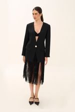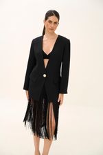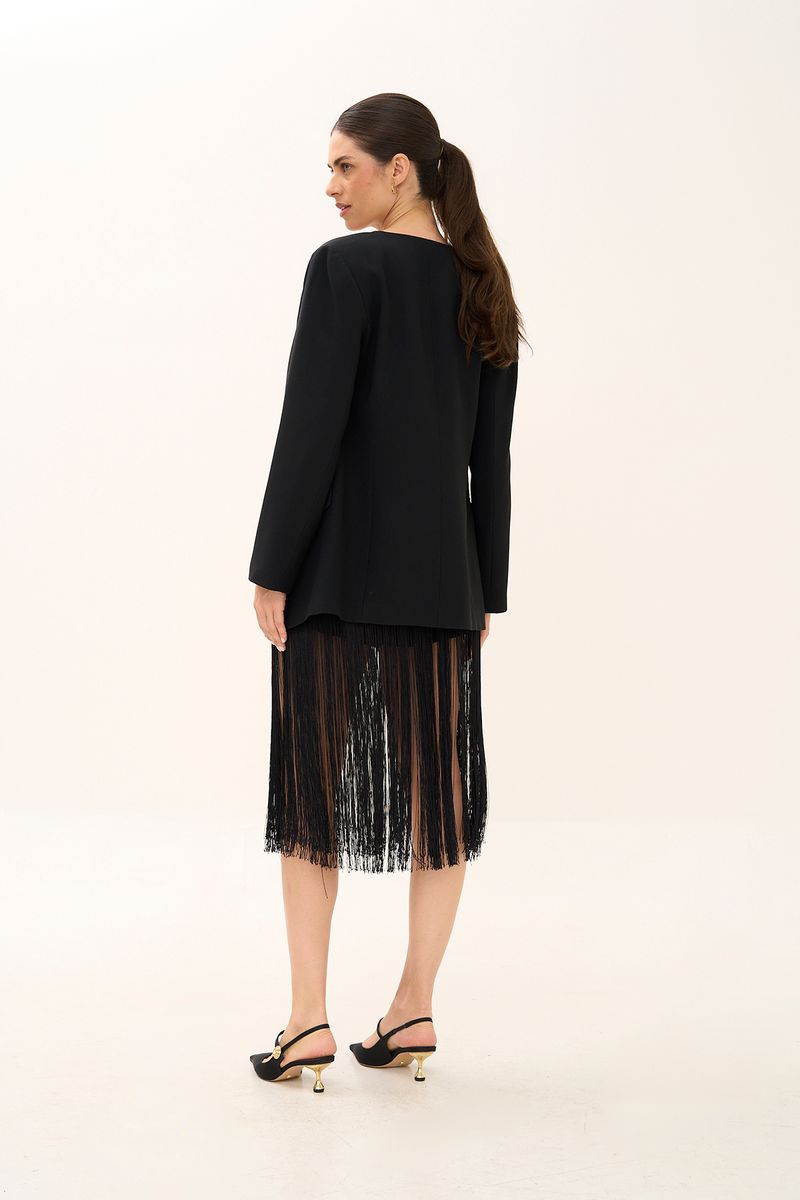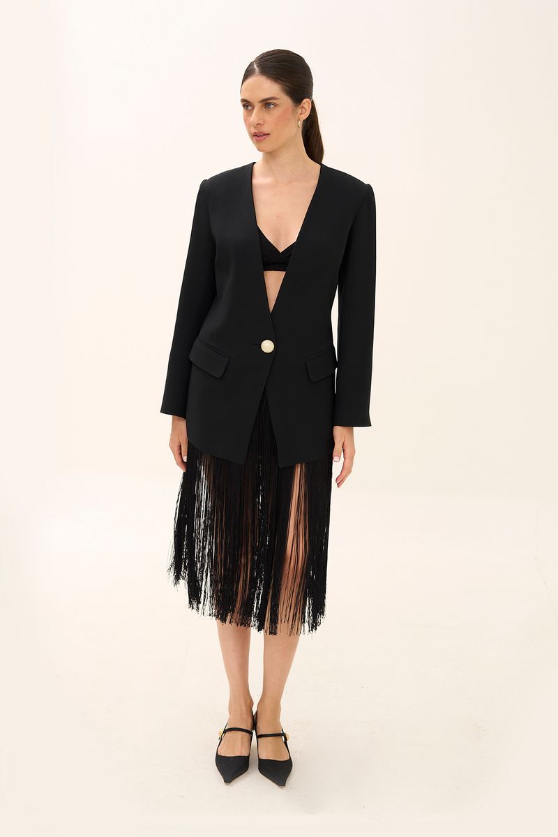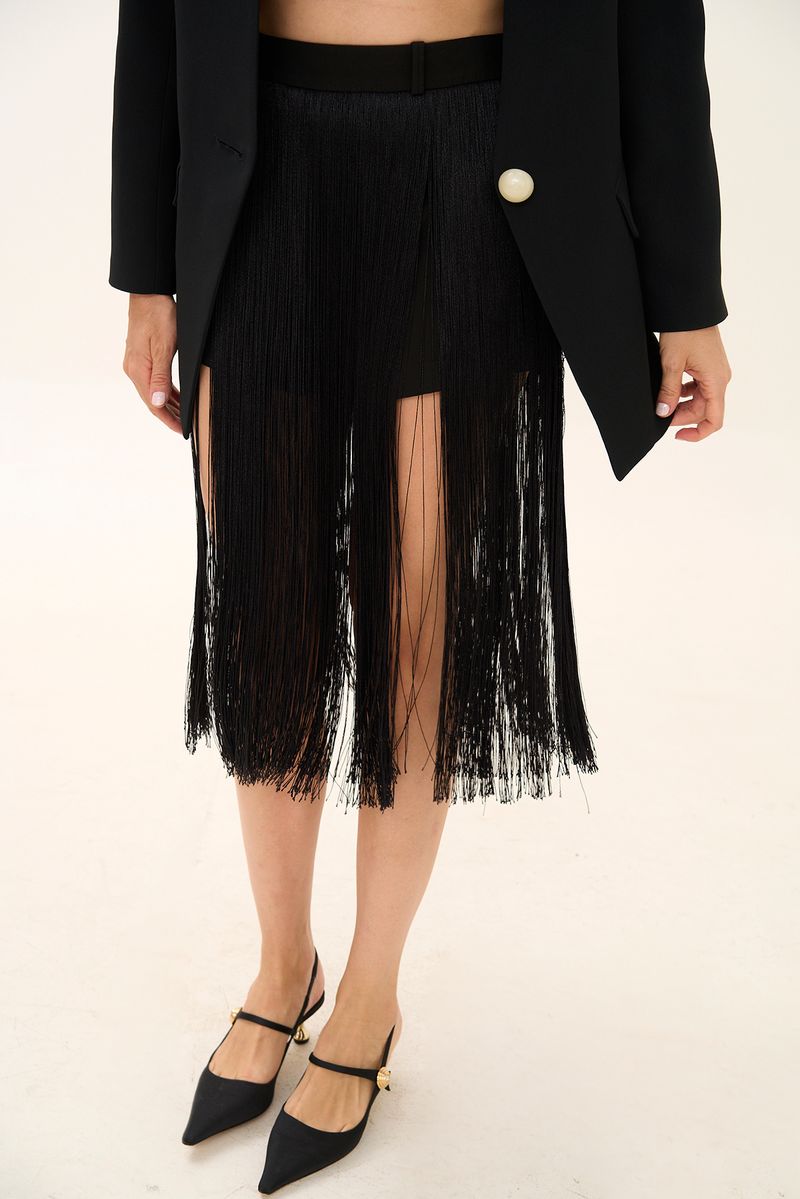Shorts saia com franjas. Modelagem reta e shape ajustado. Cintura alta. Forro embutido em shorts. Aplicação de franjas ao redor da cintura. Fechamento lateral em zíper de metal.