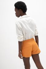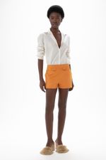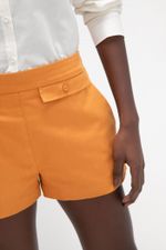 O shorts Taisa CRIS BARROS é um clássico with a twist. De Mia, sarja, que possui duas fibras naturais, algodão e cânhamo.Possui modelagem retao. Possui shape reto, cintura baixa, detalhe de mini bolsos logo abaixo da cintura com botões forrados no próprio tecido, bolsos laterais funcionais e fechamento por zíper de metal com puxador no tom da peça.