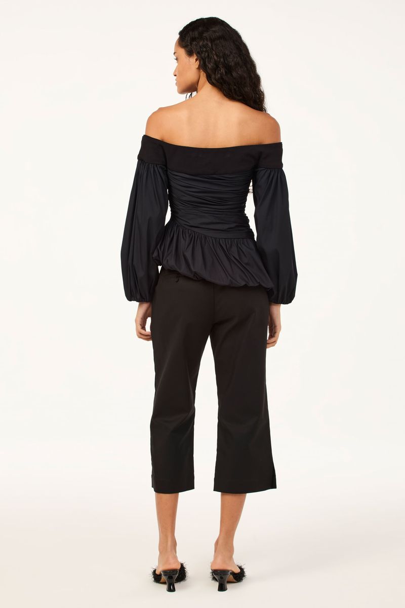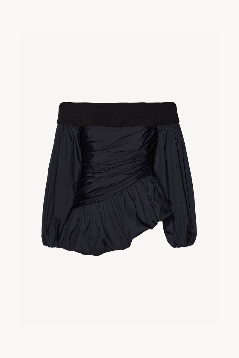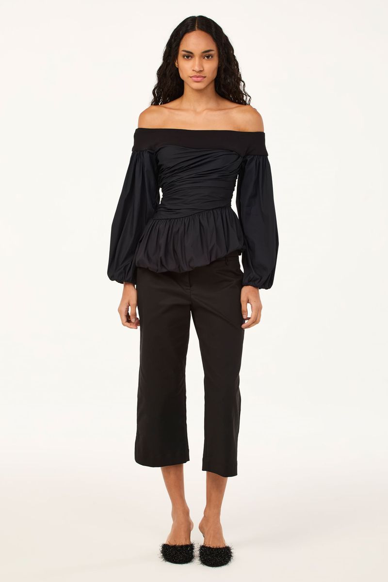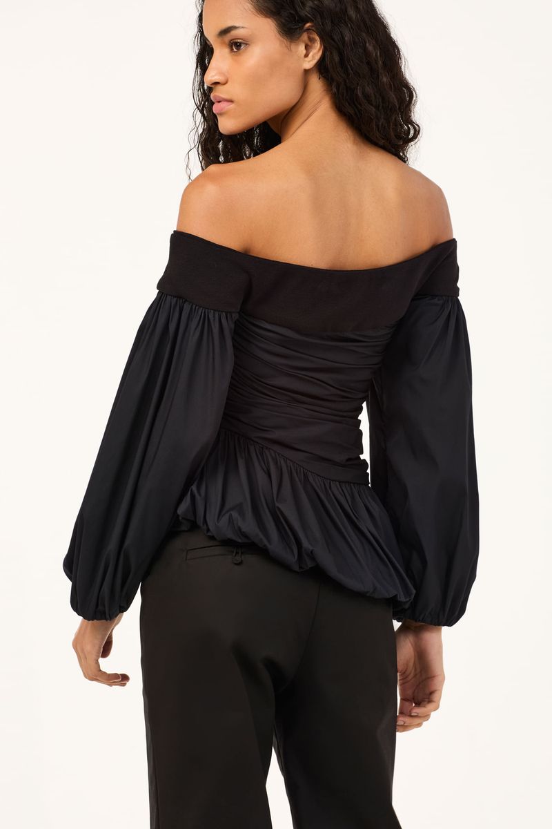 O top Adele CRIS BARROS é elegante e escultural. De Eugênia, tecido misto, confortável com caimento leve e fluido, feito de fibra de origem renovável que possui a certificação TENCEL MODAL, garantindo manejo florestal sustentável e uma produção ecoeficiente. Possui shape justo, pala do decote ombro a ombro em marjorelle, mangas longa com volume, elástico nos punhos, corpo todo franzido e barra assimetrica balonê.