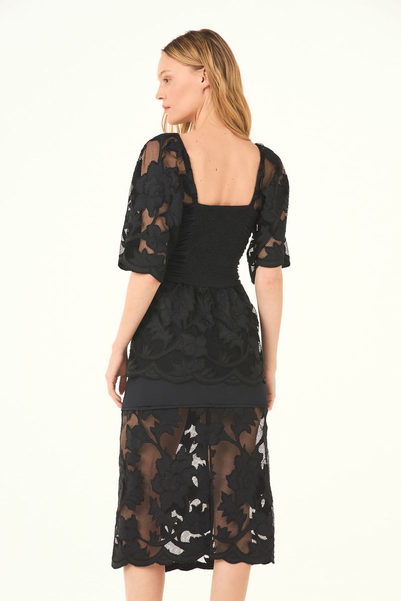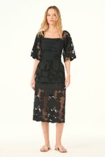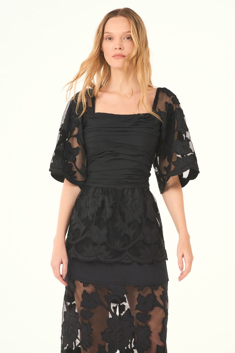 O top Alba CRIS BARROS é estiloso e elegante. De Lenora, tecido de tela que traz aplicações de crepe, recortado à laser, em formato de flores e bordados, formando arabescos. Possui shape justo, busto franzido de Eugênia, decote reto, mangas curtas e barra saindo do recorte da cintura de Lenora.