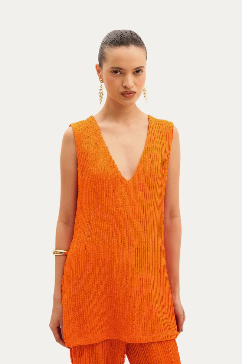 Top em tecido texturizado. Modelagem de caimento reto, decote em V. Lavar à mão. Não pode ser passado. Composição: 95% Poliester 4% Elastano.