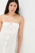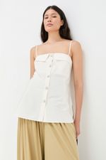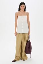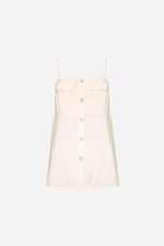 O top Aria CRIS BARROS é fashionista e cool. De Eugênia, tecido misto, confortável com caimento leve e fluido, feito de fibra de origem renovável que possui a certificação TENCEL MODAL, garantindo manejo florestal sustentável e uma produção ecoeficiente. Possui shape reto, detalhe no decote, alças finas, recortes, botões jóia com design exclusivo, desenvolvido em nosso atelier e comprimento alongado.