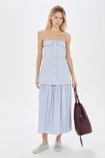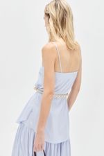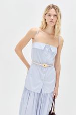O top Aria CRIS BARROS é fashionista e cool. De Eugênia, tecido misto, confortável com caimento leve e fluido, feito de fibra de origem renovável que possui a certificação TENCEL MODAL, garantindo manejo florestal sustentável e uma produção ecoeficiente. Possui shape reto, detalhe no decote, alças finas, recortes, botões jóia com design exclusivo, desenvolvido em nosso atelier e comprimento alongado.