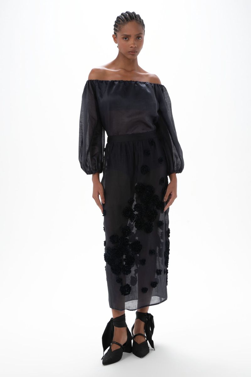 O top Berna CRIS BARROS é fresh e elegante. De Ariela, voil de linho puro, leve porém estruturado.Possui shape reto, decote ombro a ombro e mangas longas bufantes.