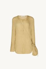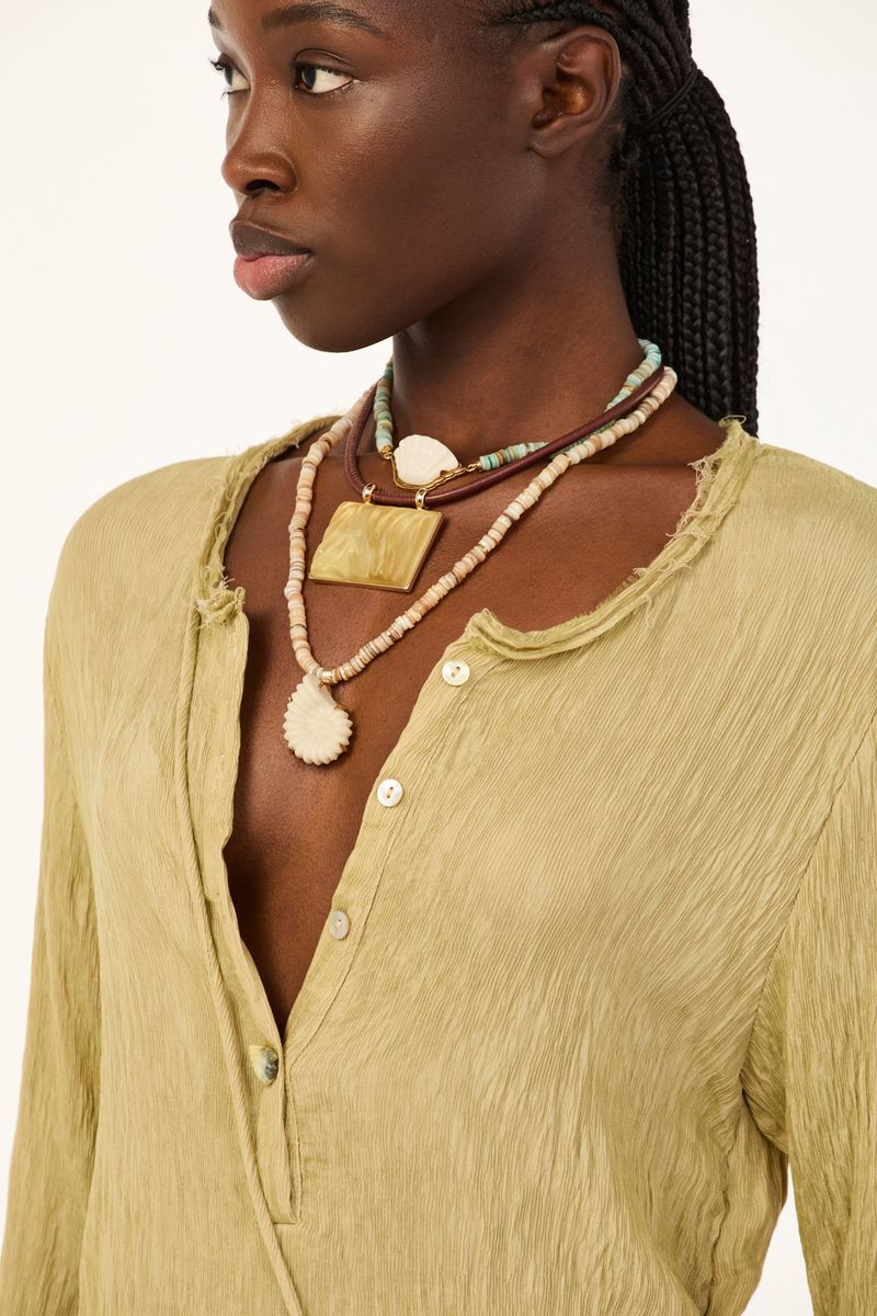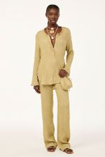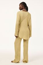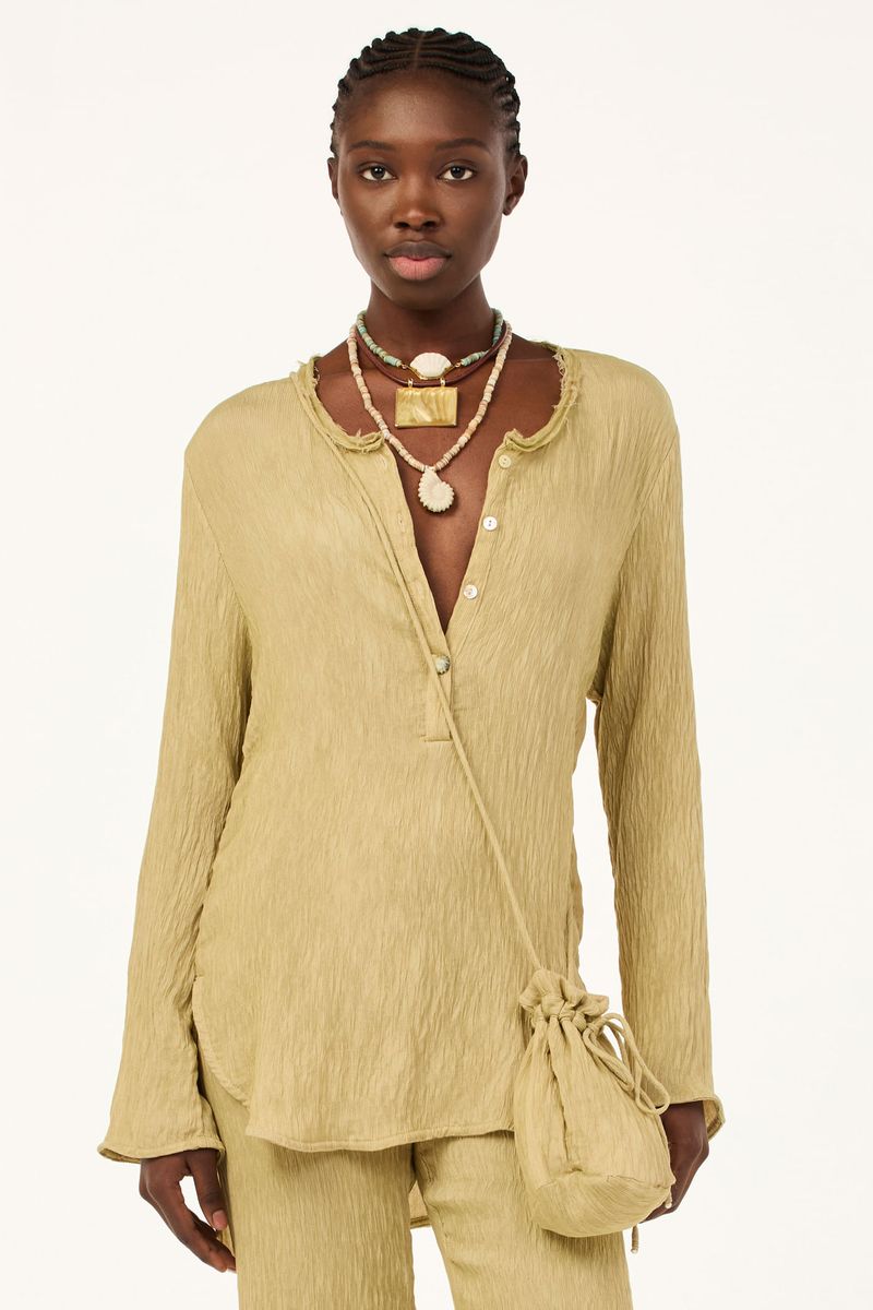 O top Beta CRIS BARROS é easy e estiloso. De Tunisia, tecido misto com toque leve, brilho e caimento perfeito. Possui shape reto, mangas longas, decote U, comprimento alongado e vista com botões de madrepérola e um botão jóia caracol banhado à ouro, design exclusivo, desenvolvido em nosso atelier. Acompanha bolsa do mesmo tecido.