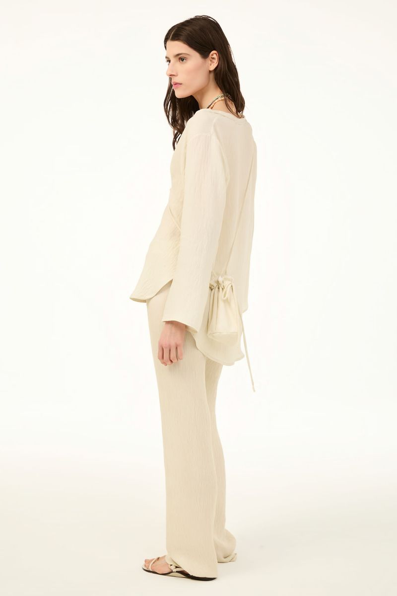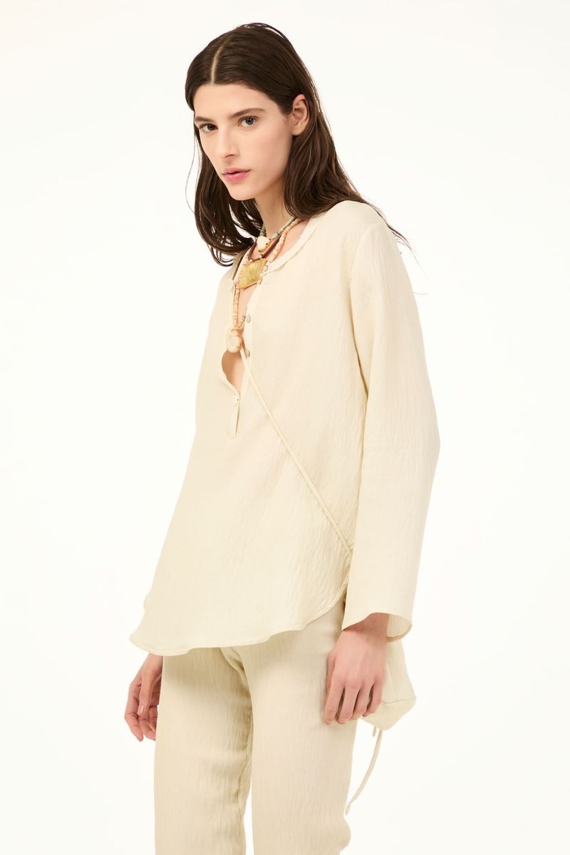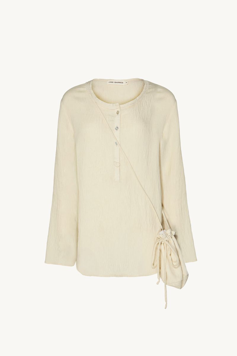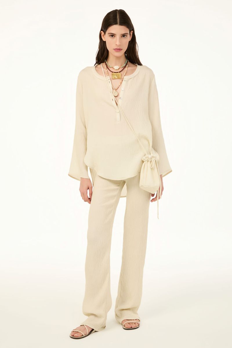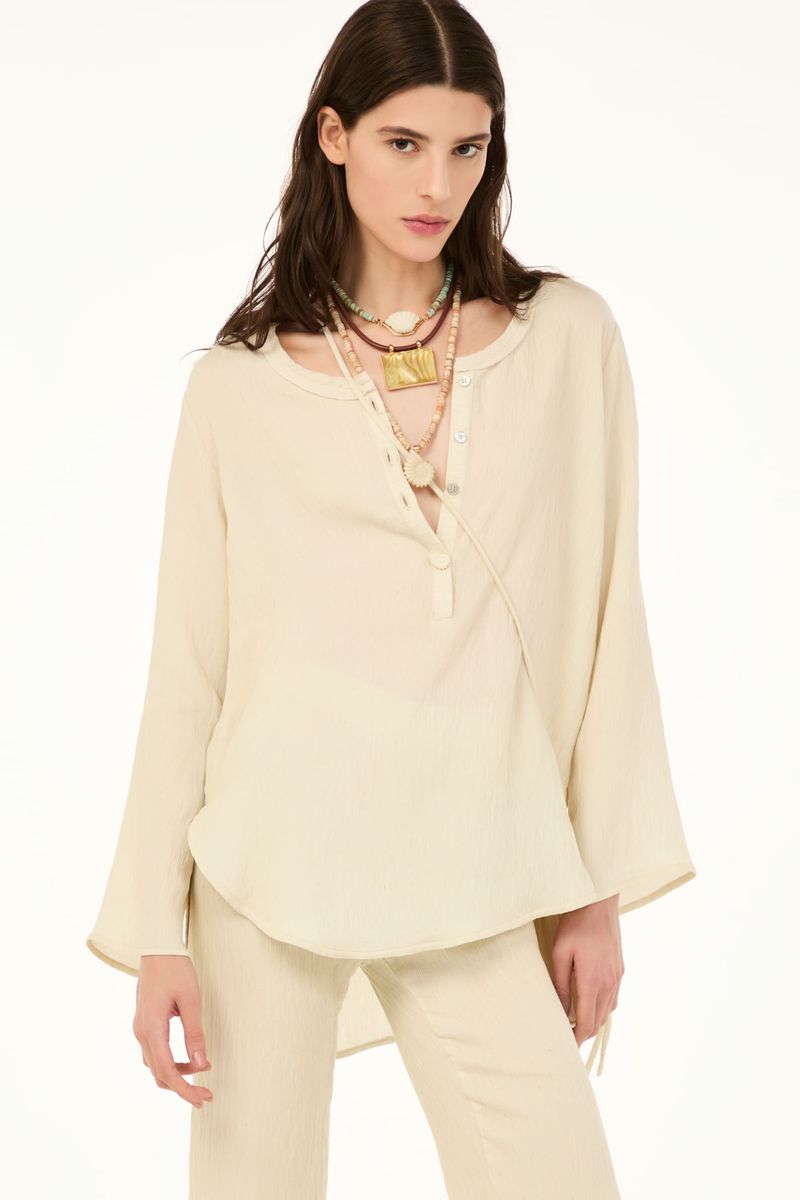 O top Beta CRIS BARROS é easy e estiloso. De Tunisia, tecido misto com toque leve, brilho e caimento perfeito. Possui shape reto, mangas longas, decote U, comprimento alongado e vista com botões de madrepérola e um botão jóia caracol banhado à ouro, design exclusivo, desenvolvido em nosso atelier. Acompanha bolsa do mesmo tecido.