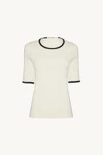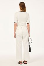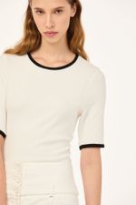 O top Camomila CRIS BARROS é básico e cool. De Rib, malha canelada de algodão penteado com elastano que proporciona toque macio e conforto. Possui fibras com certificação sustentável ABR, que são tecidos produzidos seguindo crité rios corretos de sustentabilidade. Possui shape justo, mangas curtas, decote careca e detalhes contrastantes no decote e barra das mangas.