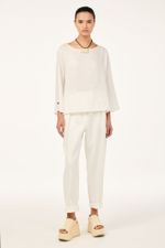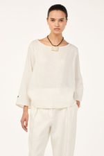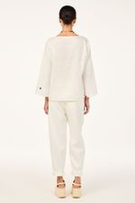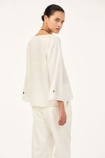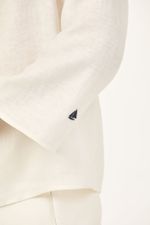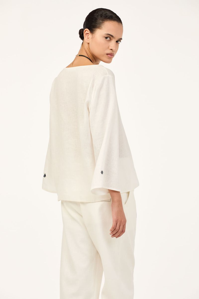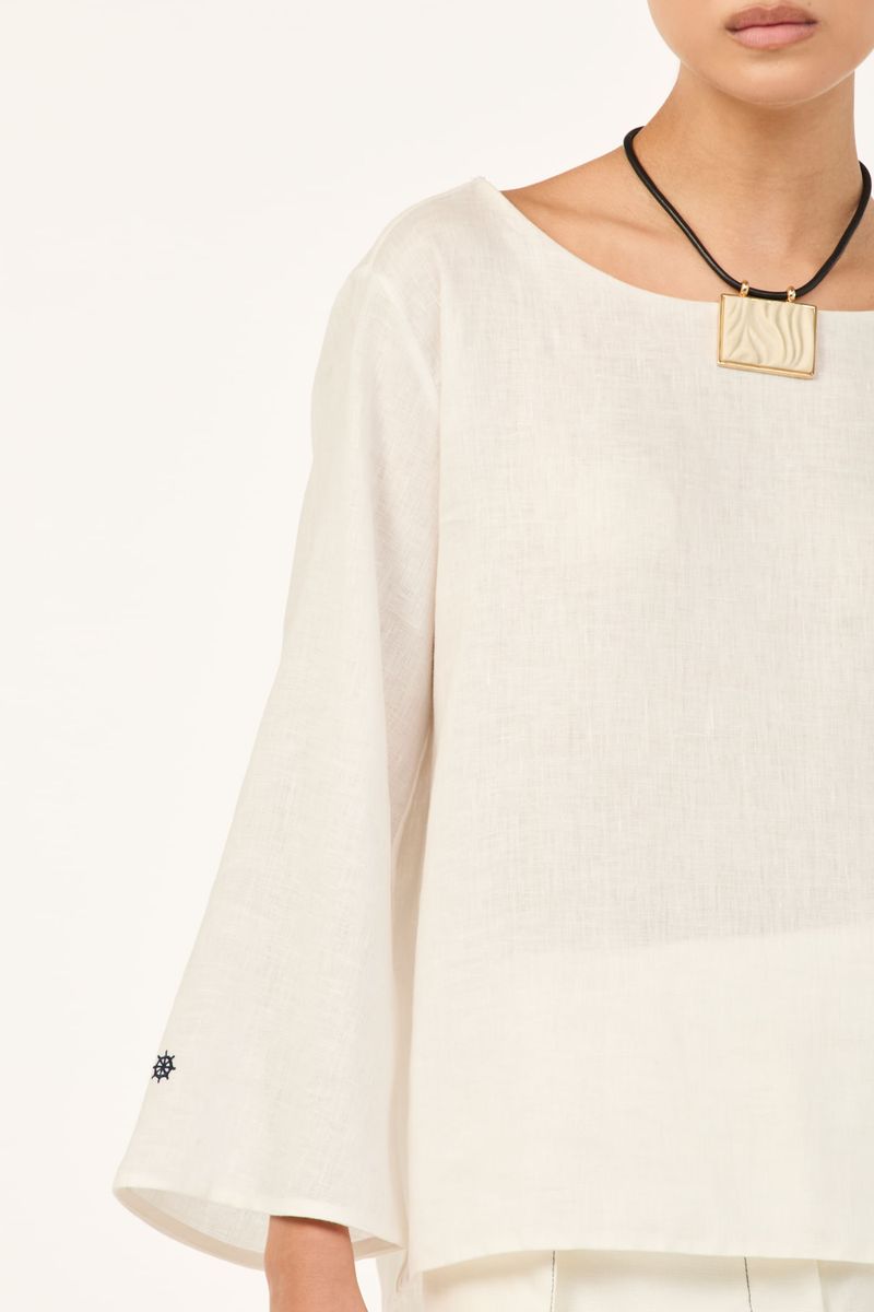 O top Cidra CRIS BARROS é fresh e descomplicado. De Patna, nosso linho puro, bem leve para o dia a dia e que possui certificação EUROPEAN FLEX e FSC, referente à conservação de florestas. Possui shape amplo, decote canoa, mangas longas e detalhe com bordados náuticos, de veleiro na manga esquerda e de timão na direita.